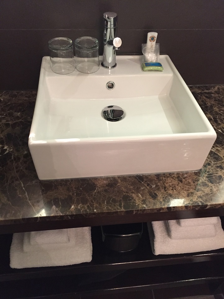 The oddity for some but design focused to others was the glass enclosed shower in room. For those traveling with others (this would be a small room to share), there is a curtain that can be pulled to shield the shower view. The bathroom is open whereas the toilet room has a door.