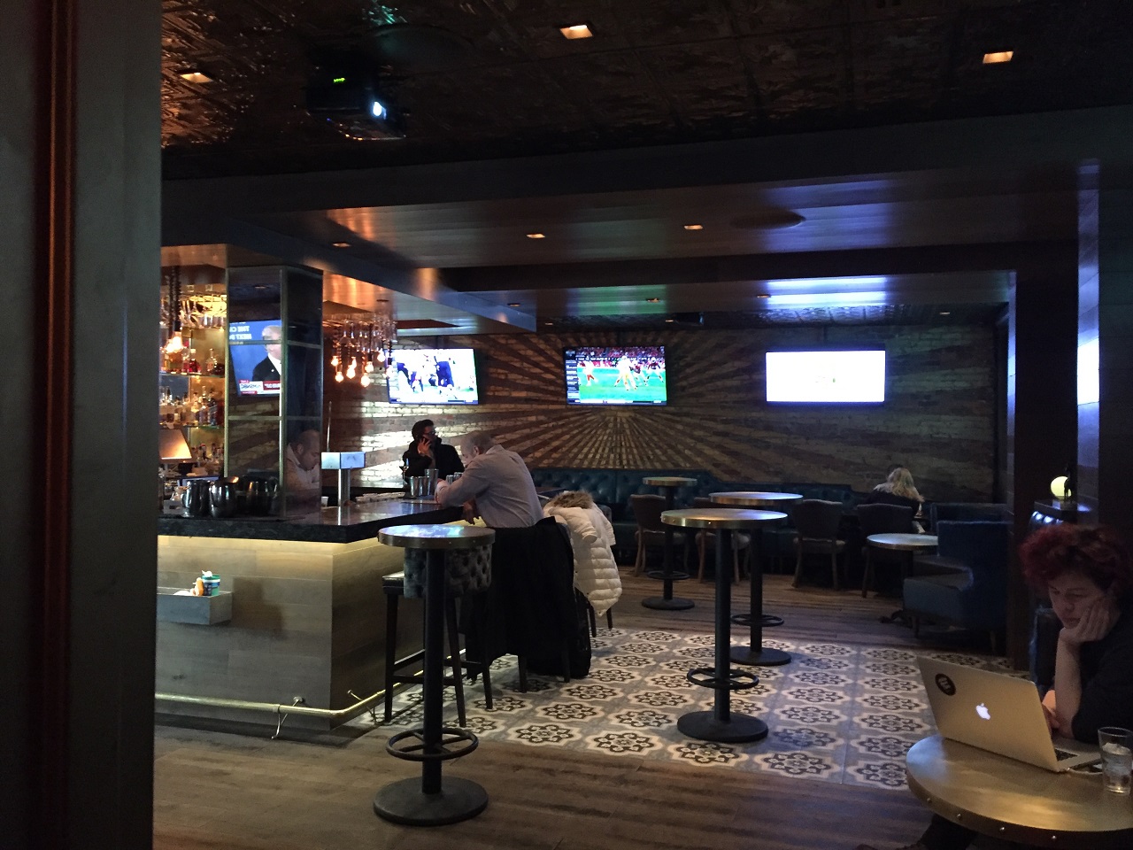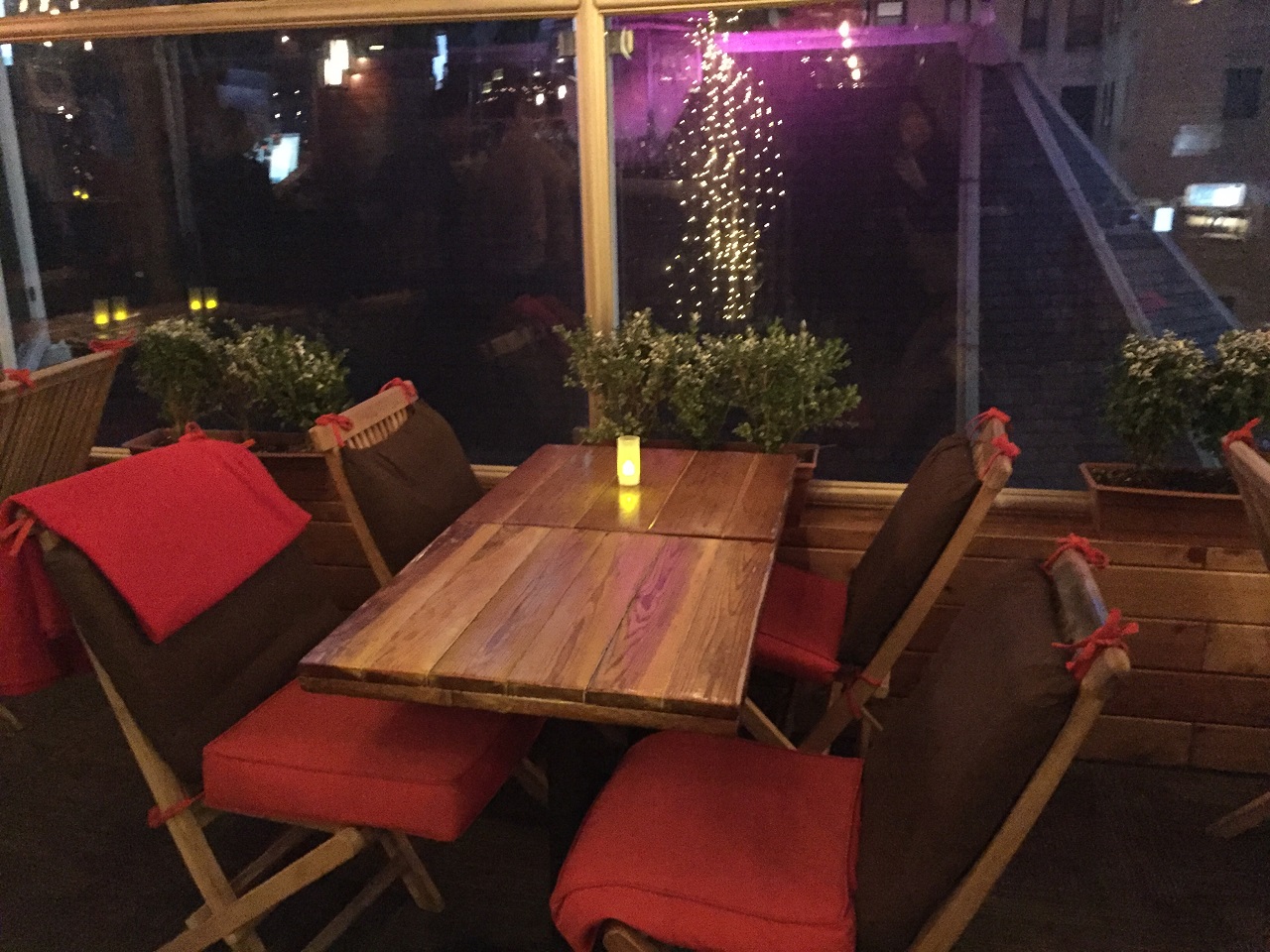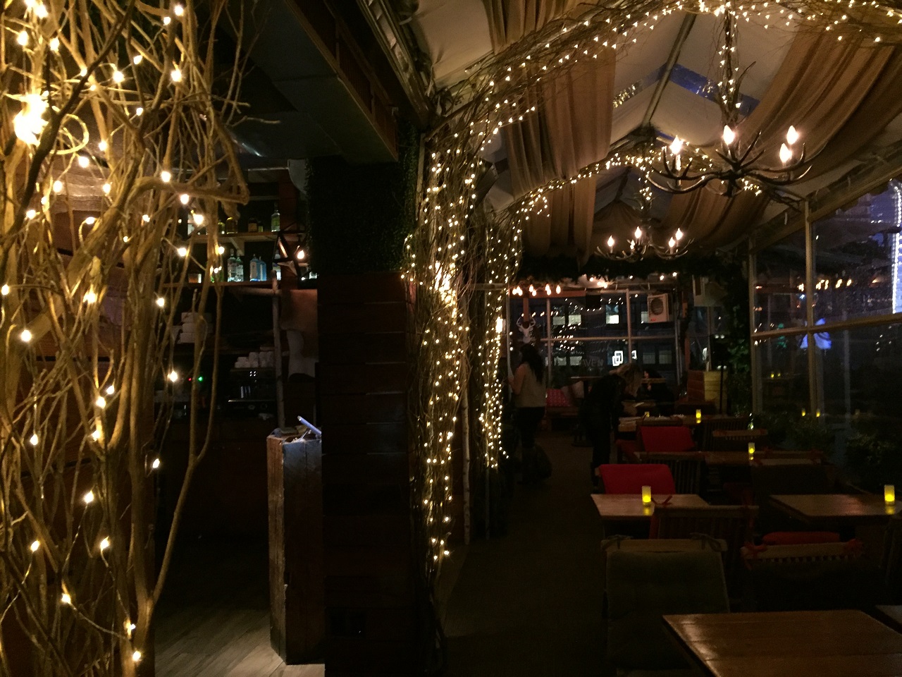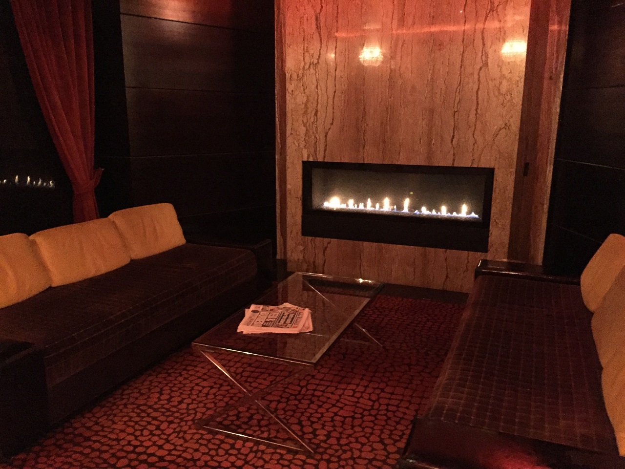 I rode the elevator to the rooftop bar, The Haven, to explore the options. As it was still a very cold winter night, the bar had plastic walls up to keep the heat inside (making for awful photos). There were two distinct areas with tables, bars and music tables. It was a quiet Sunday night with about ten people. The winter theme was ski chalet hence the blankets at each table and the food/drinks menu. I can only imagine in warmer months that this is a pretty busy place with DJ spinning music and people spread throughout the tables, bars and seating areas.