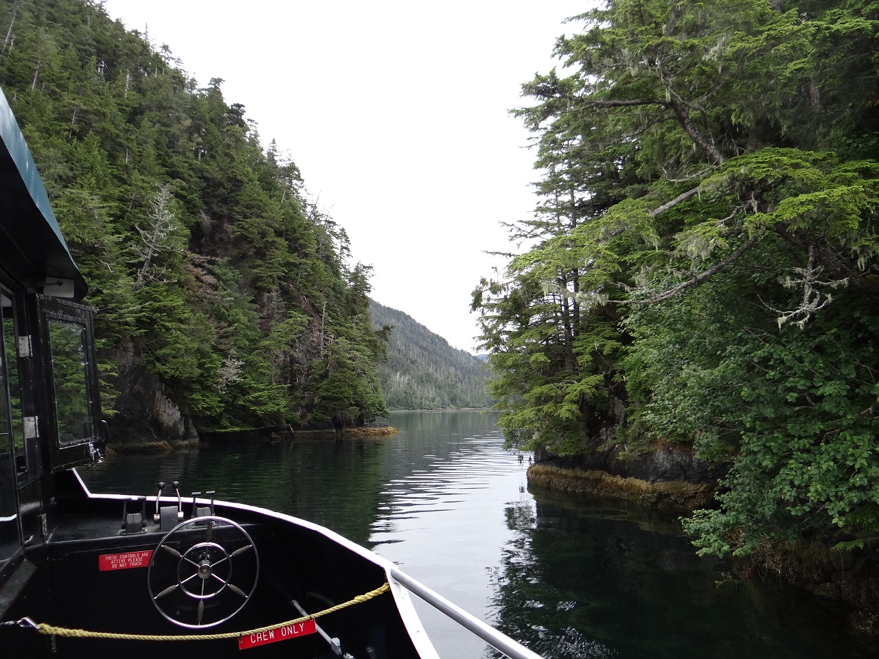 As we past the tree lined entrance, a large spoon shaped view came into focus and the boat sailed to the left side to look along the shoreline for residents. We were richly rewarded by brown bears – a mama bear and her cubs – this was a special treat. The captain tried to get in a better position, still way off land for photos. Once the bears went back into the woods, we came upon the sea otters having a lot of fun in the water. I couldn’t get enough of these animals as I didn’t expect to see them here. For me, Alaska is about bears and eagles and yet there are so many other animals that roam (or swim) in the state.