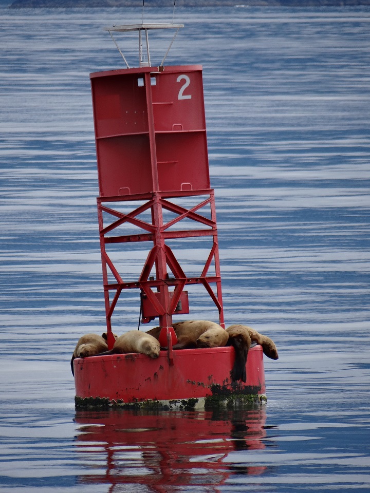 Not to be overlooked in the water, we had the sea lions on the buoys. With all the excitement over the playful whale taunting us, the sea lions and seals just swam around and a few were sacked out.