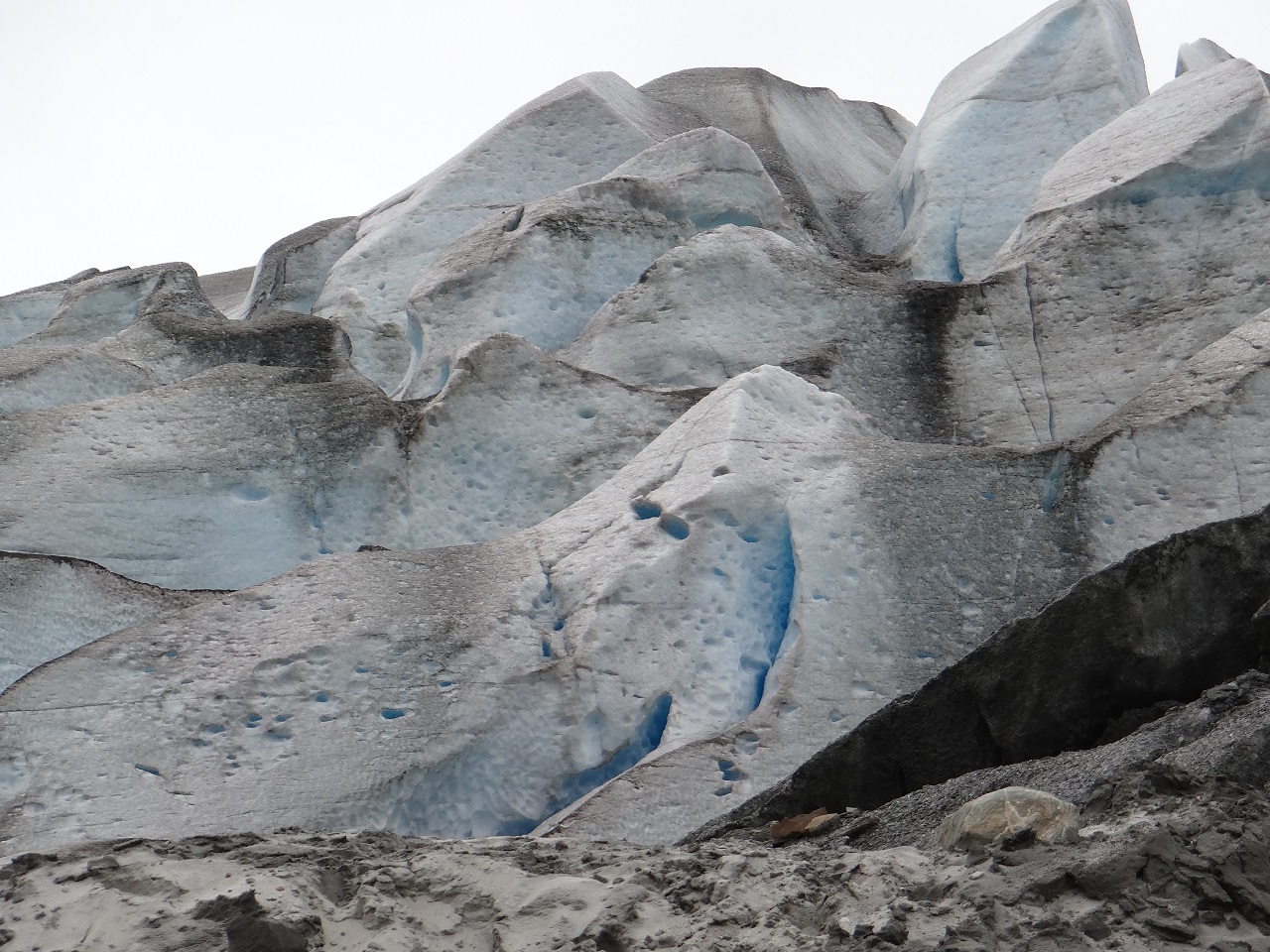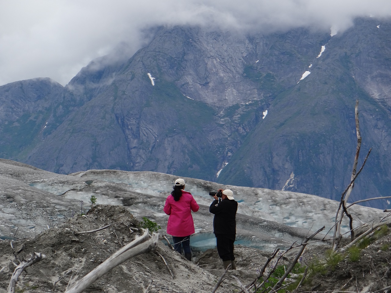 As for me, I was bootless in my hiking shoes so I had to stay on the one side of the glacier because the water was a bit too deep (and cold) for me to walk through (and no one could carry me across). No worries about this as I was left with my side of nature to explore all to myself plus they didn’t walk too far as my telephoto lens could capture the same views from afar. As the Taku Glacier is advancing (moving ever so slightly), you could see the white/blue colors of the glacier as well as the darker parts.