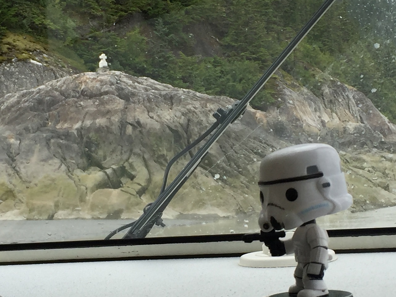 When we reached The Glacier boat near the glacier, we disembarked and received instruction while we waited for the hovercrafts to return from an earlier tour. Our boat of 23 was divided into three groups (generally eight people on each hovercraft, as I was solo, there was only seven passengers) and lined up outside ready to board our hovercraft after the passengers disembarked them and came on board. We were offered boots to wear (tip: put them on!), offered snacks and given the opportunity to use the bathroom before our hovercraft adventure began. As a solo traveler, I was able to sit up front across from the driver and we had three couples onboard. We were given a quick overview of the boat and told to put on our headsets to communicate. And then the boat rose up and began floating on top of the shallow water (the hover part) as we glided quickly across the water toward the sand along the shoreline. With his StarWars bobblehead, we were off to a great start! Our driver was one of many who travel the world during the seasons (what a life!) – he was in Alaska for the summer season.