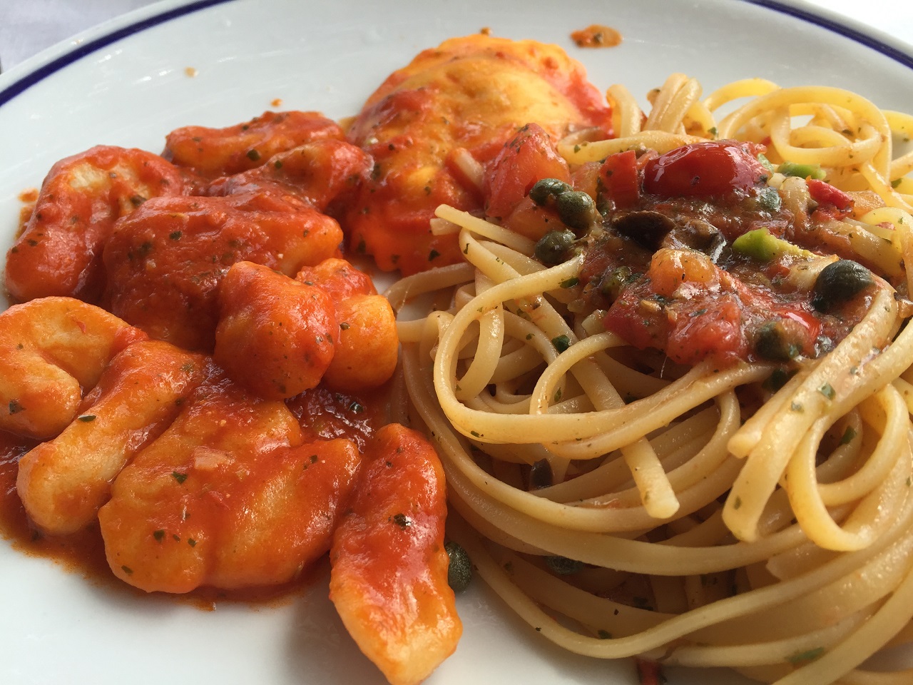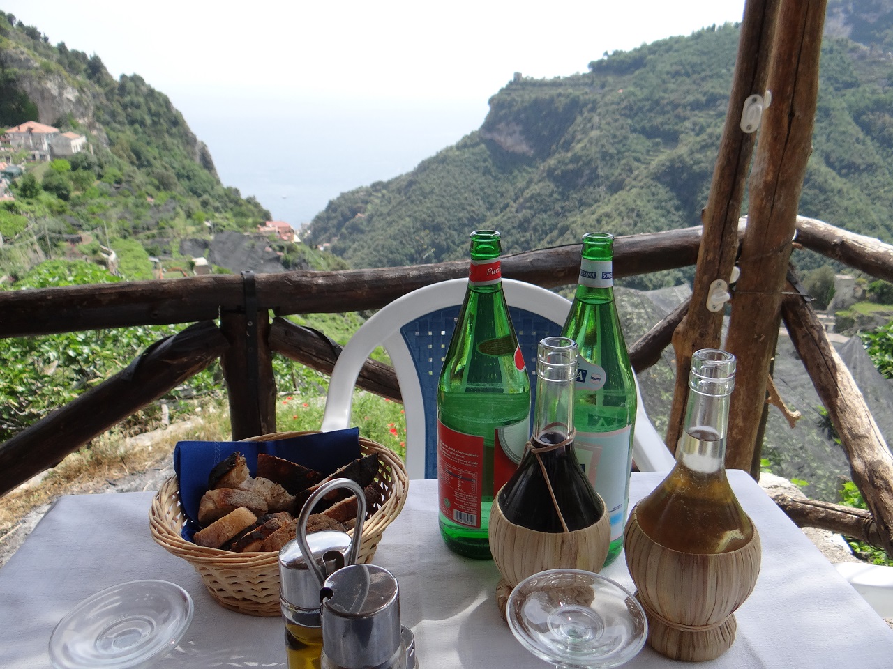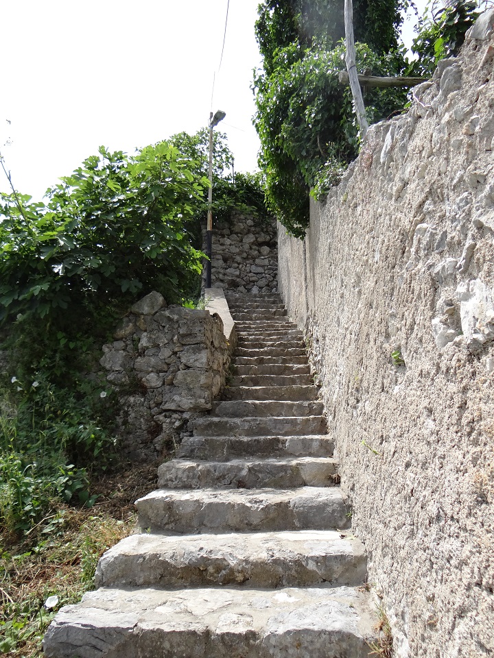 Walking up the steps (there were many steps) we passed homes with lemon trees in their gardens and the smell of flowers growing all around. The small lanes were lined with homes and the stone path continued upward until we reached the restaurant. A bit of a huff and puff was rewarded with a view, some red wine, Italian pasta, bread and desserts.