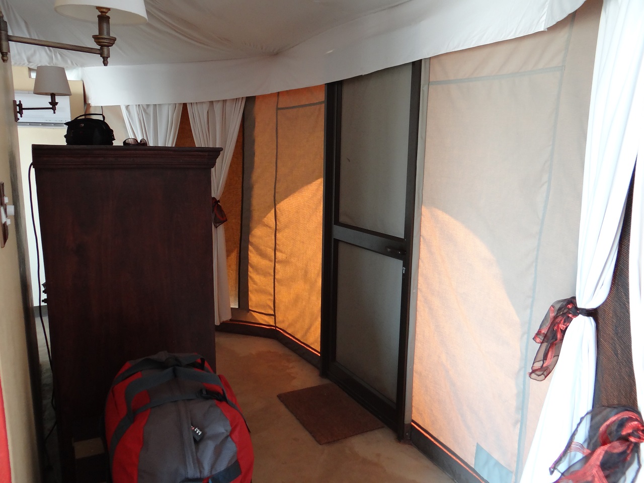 I was shown inside and greeted by a wardrobe and steamer trunk to store my gear.  Arriving with my bright orange duffel bag and backpack instead of the luxury, designer luggage on wheels the other guests arrived with made me eschew the fancy storage area and live out of the bag as I had the past week. The floors were concrete (of course my shoes brought in the sand and dirt) and some of the walls could be rolled up, while other parts were sliding glass doors to open up and bring the outside that much closer to expose you to the elements.
