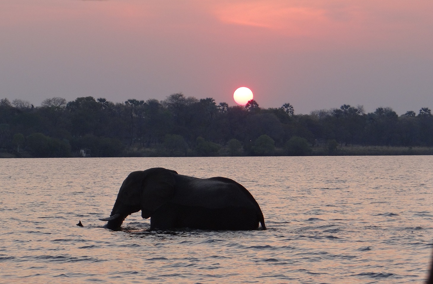 The perfect ending to my Victoria Falls visit – Sunset on the Zambezi River with an elephant crossing