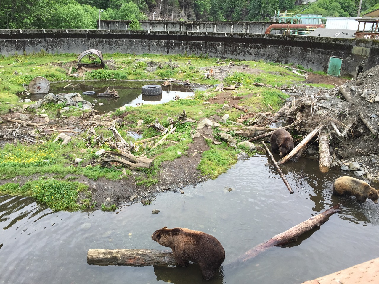 Hard to imagine but Alaska doesn’t have any laws on the books to protect bears with rehabilitation programs. “Bullets are cheaper” I was told by the Fortress of the Bear staff member when I asked why the bears needed to be rescued. She told me a story of a hotel owner who was luring bears into town so his hotel guests could “spot” bears on their trip. I was disgusted, but when the mama bear was trapped looking for food she was shot and killed as an act of self-defense (legal). The Alaska Department of Fish & Game would then normally kill (euthanize) the cubs who can’t survive without their mother. But in 2007, the Fortress of the Bear was born in Sitka, Alaska to rescue and rehab bear cubs. Now the Department of Fish & Game works with the Fortress of the Bear rescue in the hopes of someday releasing the bears back into the wild. For now, the Fortress of the Bear has a few permanent residents while others get rehabbed and relocated to zoos and other rescues across the United States.