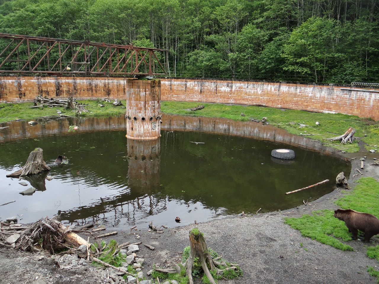 I didn’t know what to expect – cages, free roaming areas, etc. so I was happily surprised when I walked up the stairs to the viewing platform to see two enclosures that were repurposed silos (they are waiting to expand to a third nearby) with eight bears wandering about (sadly since my visit, one bear has passed). The large silos have water areas, grass, tree branches and play items like tires and such.