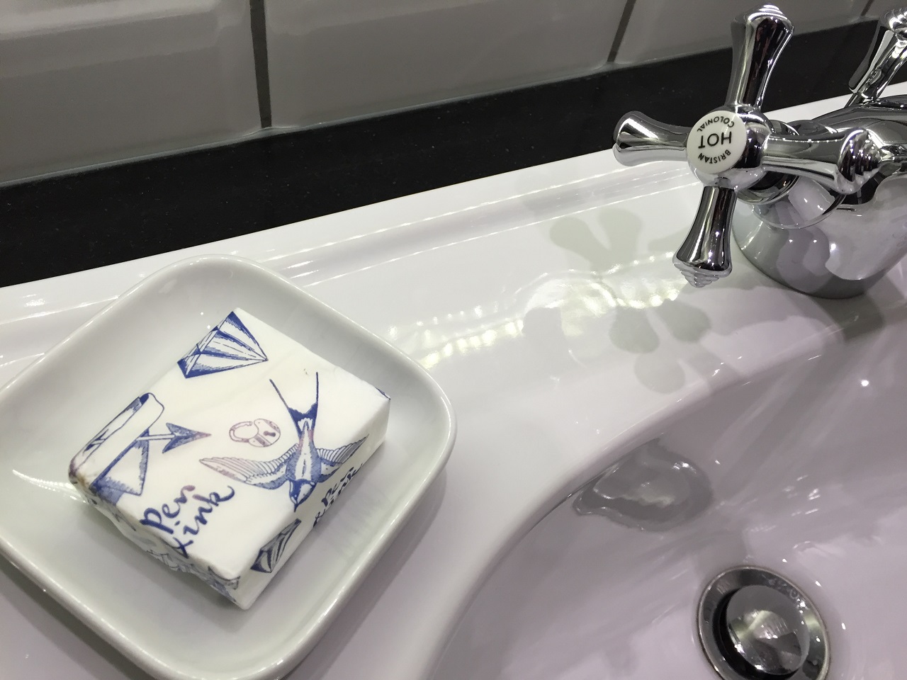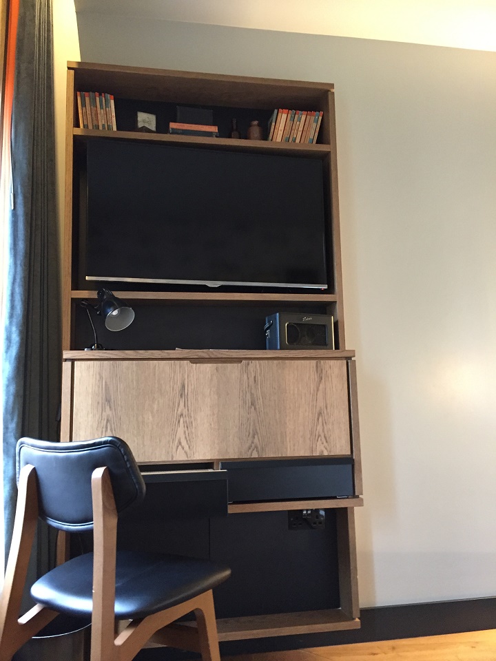 With a round mirror across from the bed, the room appeared larger than it was. There were many clever touches to utilize all the space that the room had to offer. The desk served many purposes – with a swivel flat screen, coffee/tea making amenities, an easy to find hairdryer, Hoxton Survival Guide listing all the hotel’s services and amenities as well as a map of Holborn with in the know recommendations like the Cartoon Museum (who knew?). With a radio, shelves and well-worn paperbacks, the desk was multi-purpose.