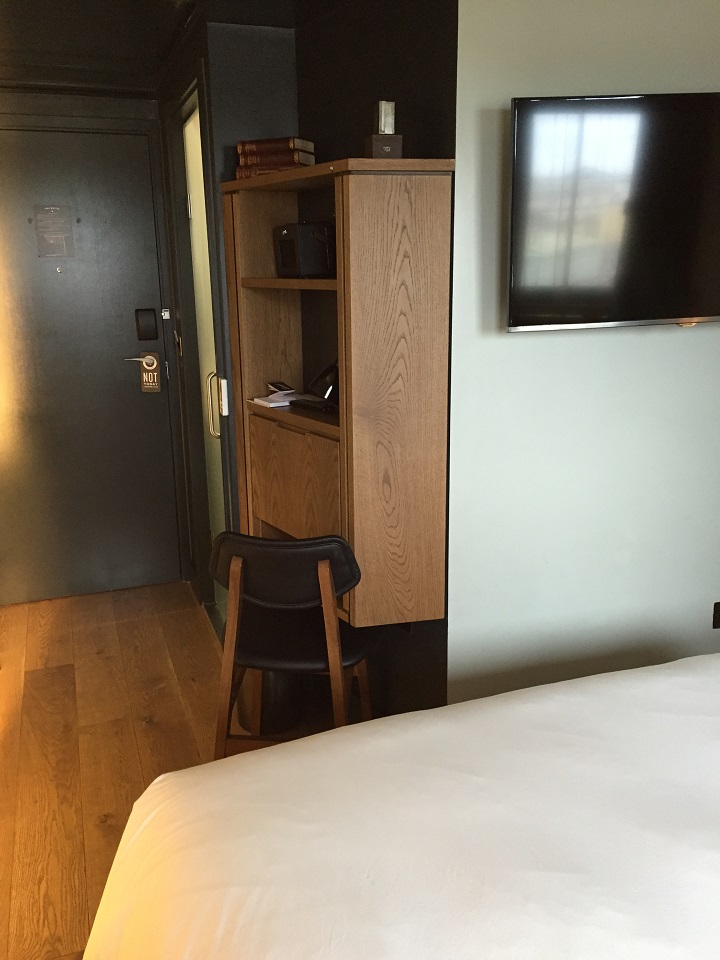 The hotel has 174 rooms in four room categories aptly named – Shoebox, Snug, Cosy and Roomy. They are small compared with American standard rooms of 300 sq. ft. as they range from 129-247 sq. ft. but you’re in London so you shouldn’t be in your room much. I was able to tour the Shoebox room and you can still walk on both sides of the double bed. It is good for a solo traveler or a couple without much luggage. The room rates vary but I’ve seen the Shoebox start at £99. The rooms are also listed on Hotel Tonight but you don’t know which category you’ll get as they are selling open inventory (new to Hotel Tonight? contact me for a $25 credit on your first booking).