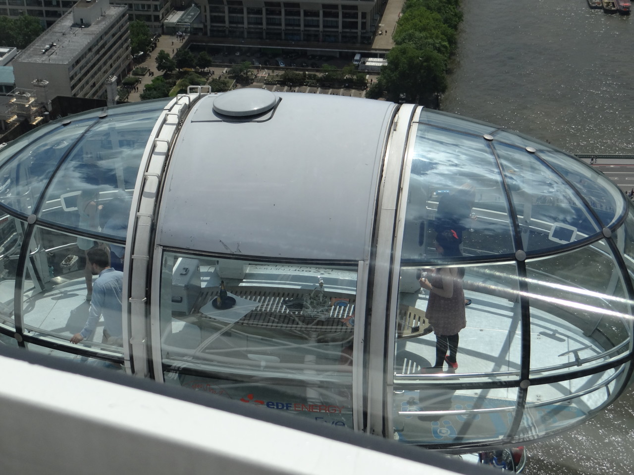 She pointed out the private capsule below us that had a wine/cheese party going on (you can rent a private capsule for different tastings/events starting at £350 – the wine tasting is one hour, two rotations for £870 – for that amount I’m sure my friends and I could enjoy a lot of wine at a pub, heck we could buy drinks for the whole pub and have change!). We both commented that a private capsule would be nice to avoid the view hogs and have a seat but when I told her the prices, she replied with her now famous “Whoa” (channeling Joey Lawrence who was before her time).