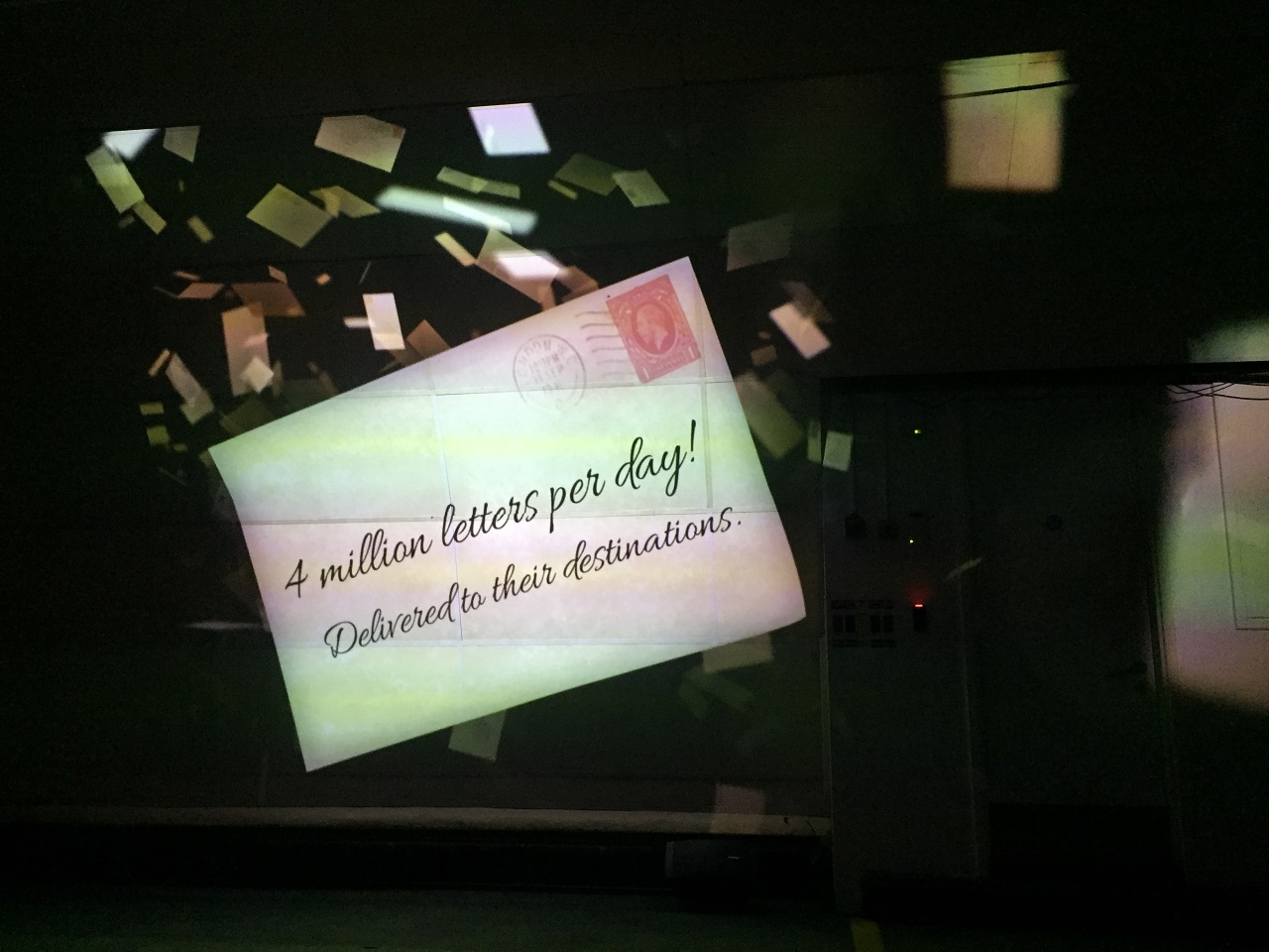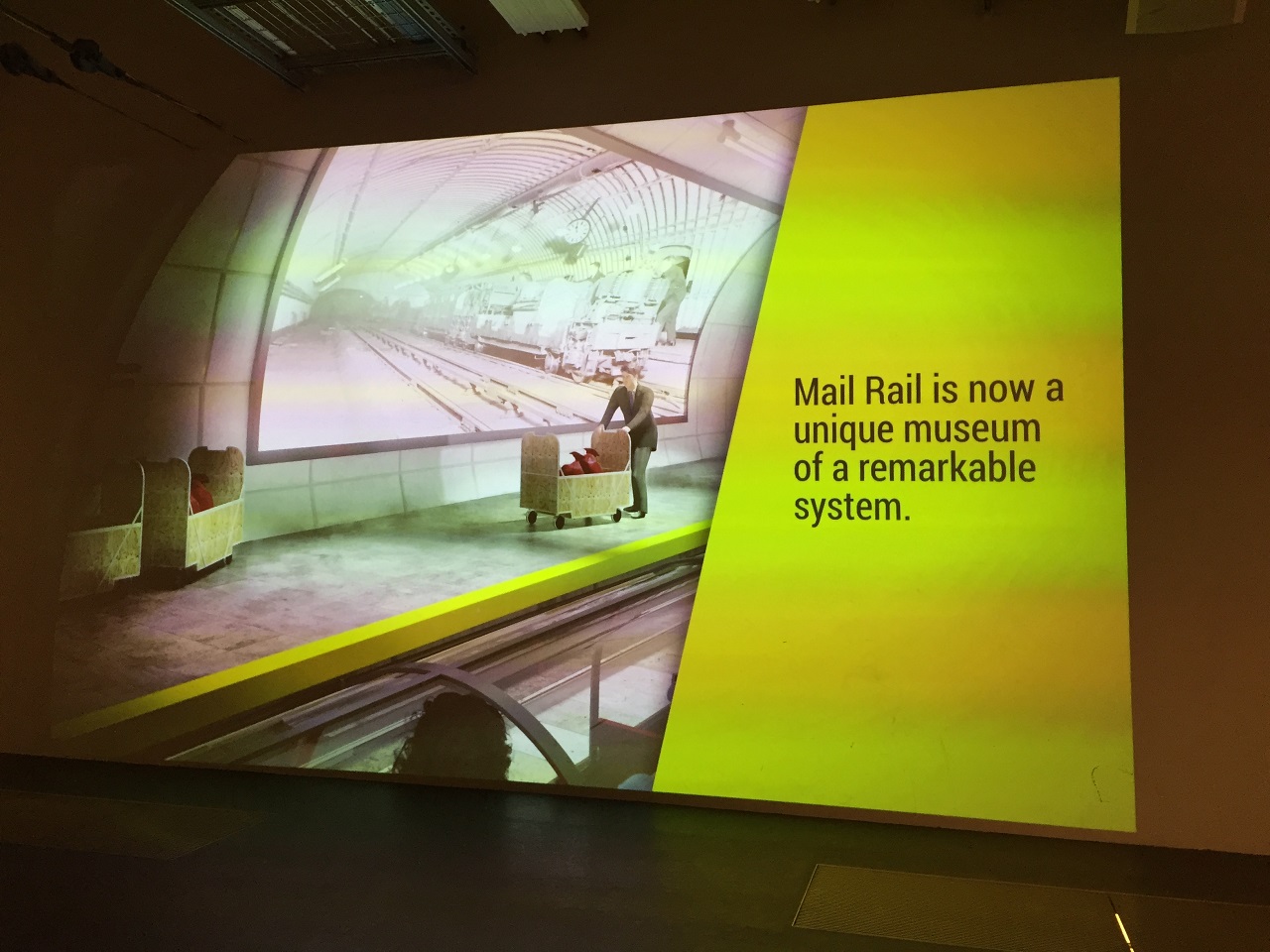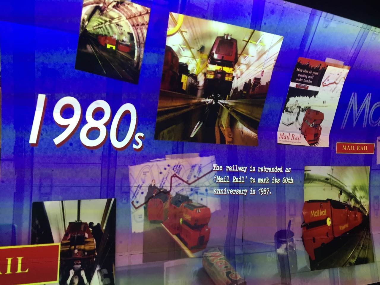 The glass overhead is closed to secure the train (claustrophobic feel for some) and the driver has a short announcement before we are off and the audio tour begins (speakers overhead). The narration follows the train and we stop at the first platform to see a video projection of the history of mail, the mail rail and London. It’s a bit Disney-fied which frankly was a great touch. The experience transports you back in time and follows the letters, the workers and the people behind the stories over the years.