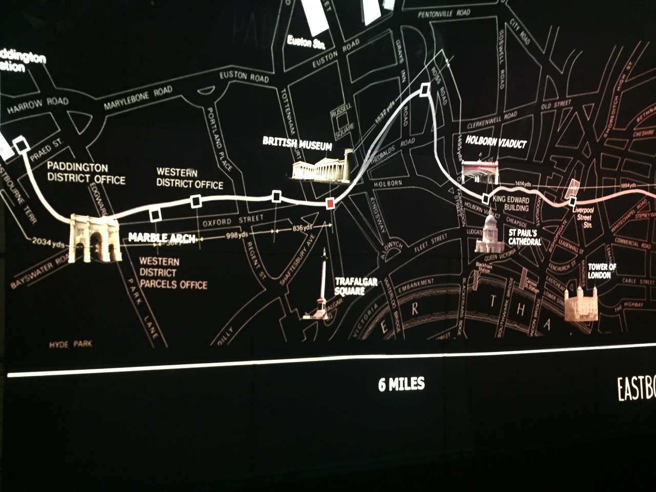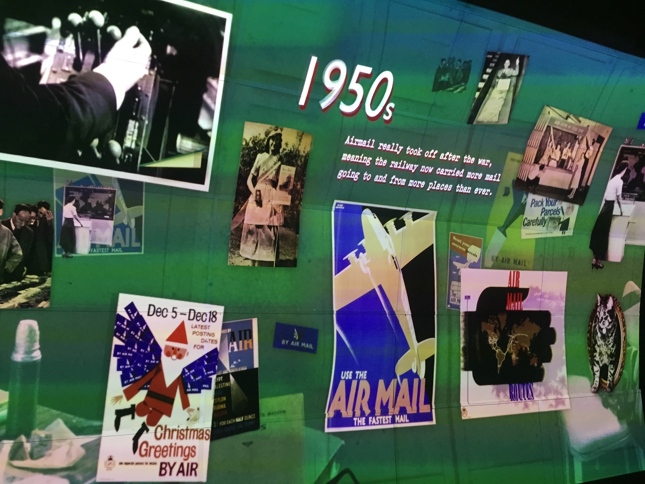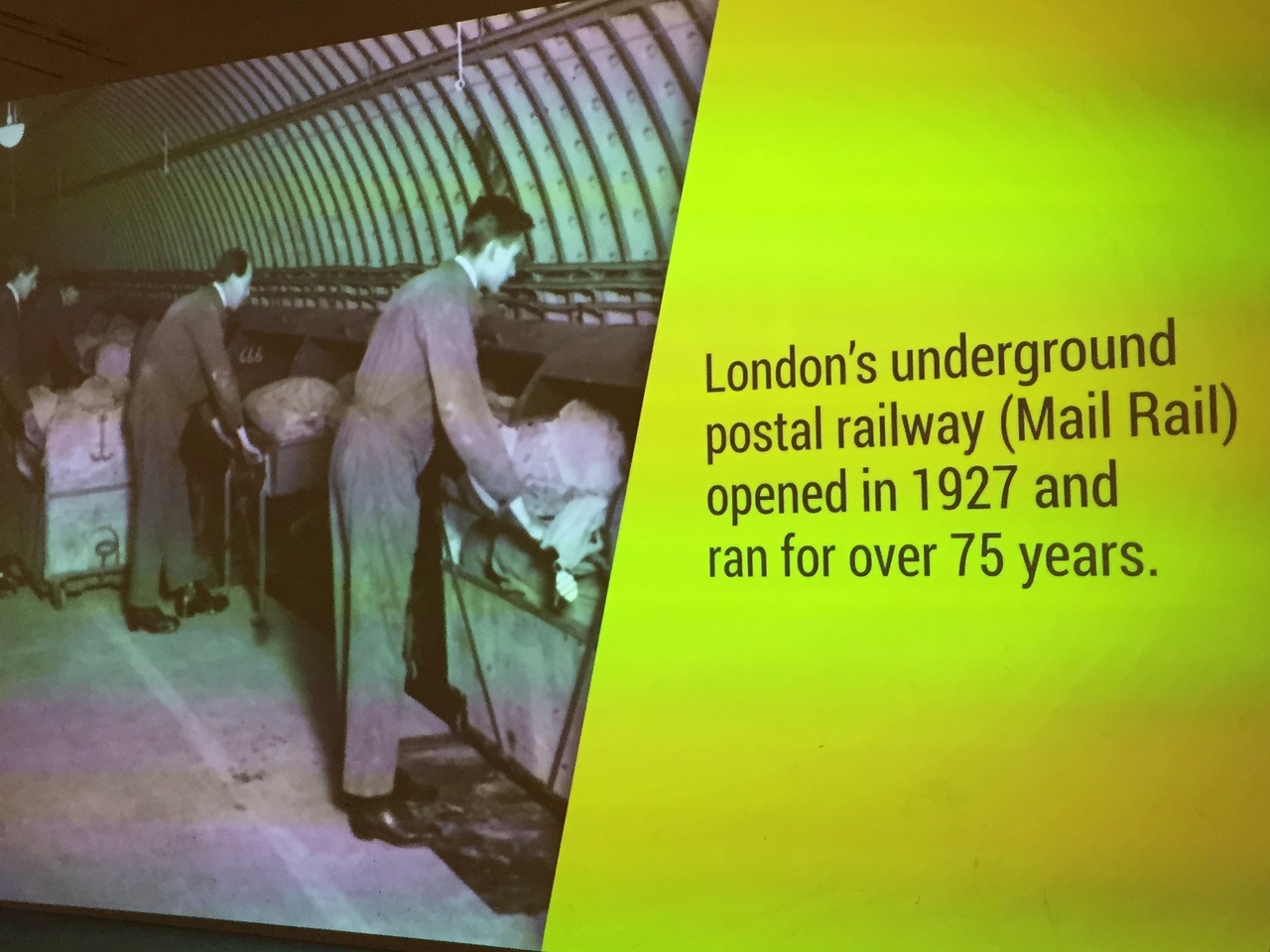 The glass overhead is closed to secure the train (claustrophobic feel for some) and the driver has a short announcement before we are off and the audio tour begins (speakers overhead). The narration follows the train and we stop at the first platform to see a video projection of the history of mail, the mail rail and London. It’s a bit Disney-fied which frankly was a great touch. The experience transports you back in time and follows the letters, the workers and the people behind the stories over the years.