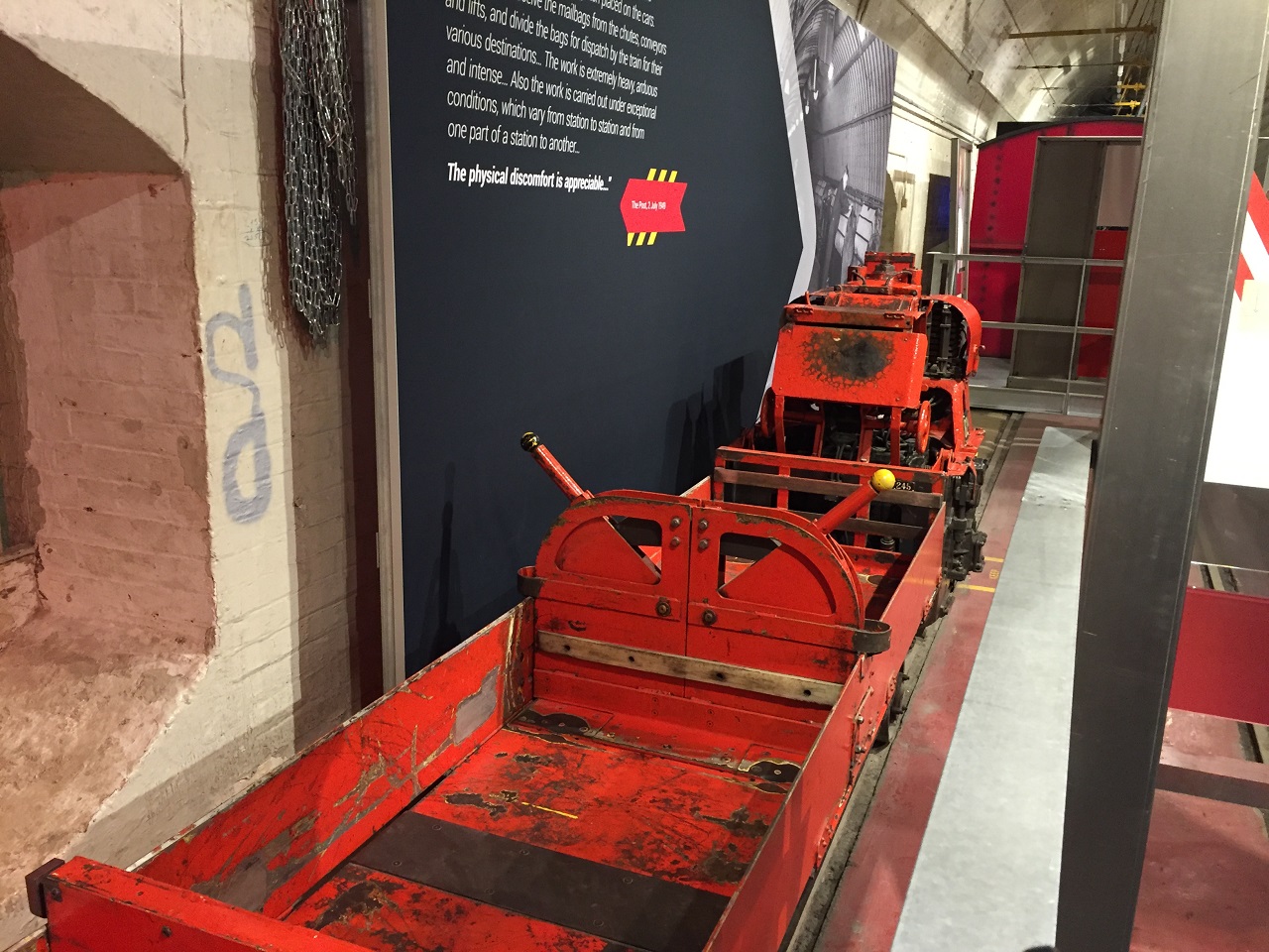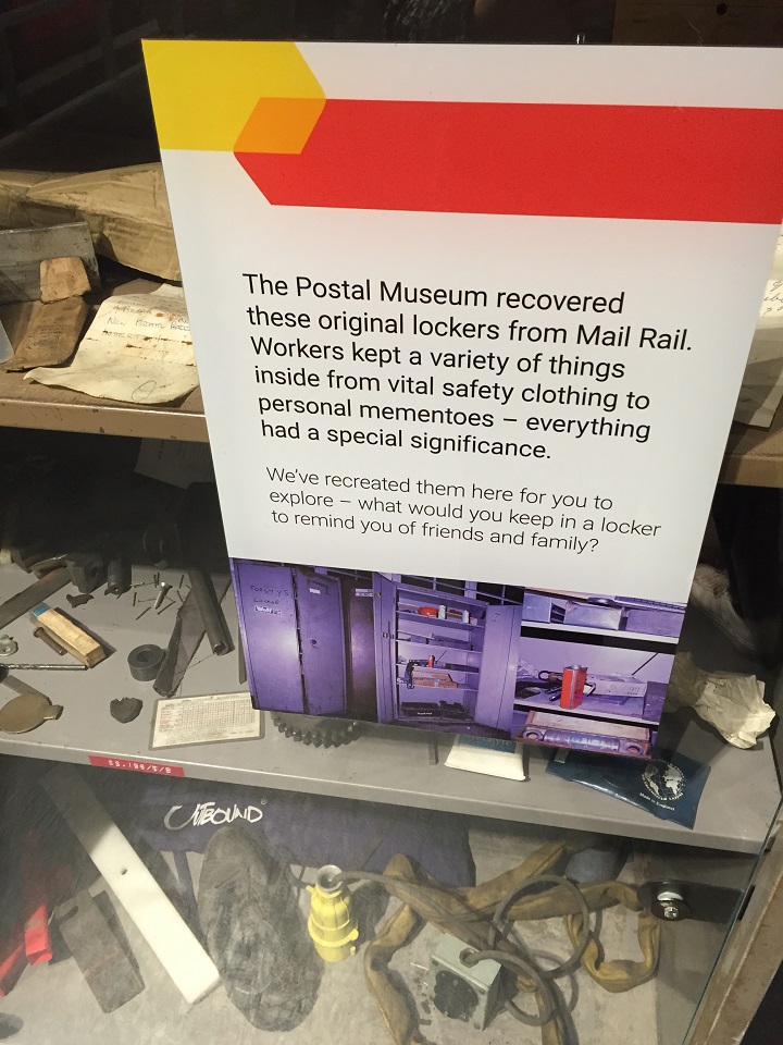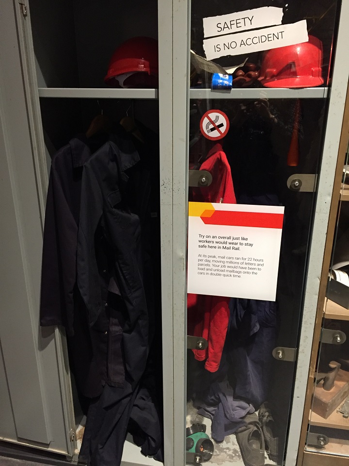 The U-shaped exhibit area begins when you disembark the Mail Rail Train. The wall showcases a map listing the stations across London that the Mail Rail serviced. Next to the map is the train driver’s car used to maintain and ride the rails – super small if you try to climb in – I tried and didn’t fit. Second is the workers storage lockers, a few intact from the final days of service. The interactive part is for children mostly to try on the equipment and clothes. In this area there is also a tool box to show a few of the necessary objects needed to maintain the mail rail train cars, tracks and other equipment at the platforms.