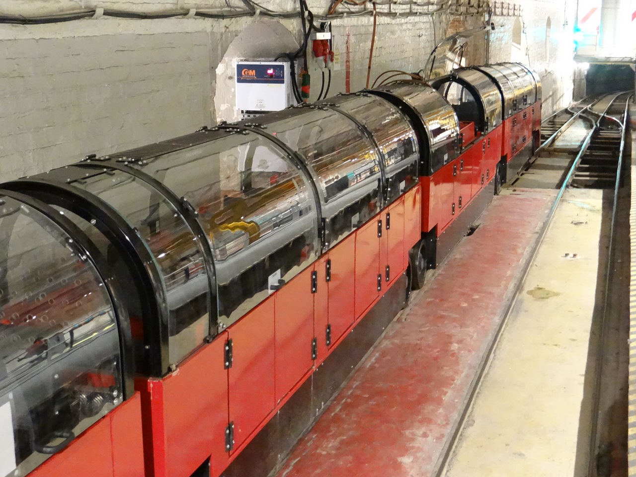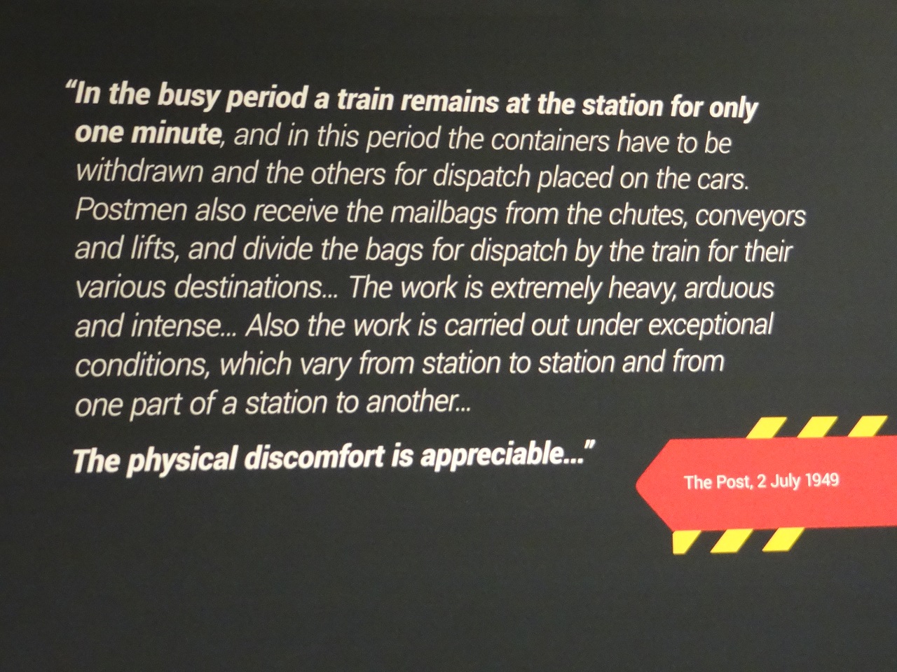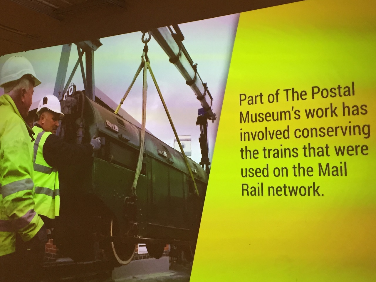 When you enter the large room the video projection is on the right hand side which provides a short film history of mail rail. Around the room are various descriptive boards and the main attraction is on the left – the small trains that have been upgraded to (snugly) fit people into the compartments that used to carry mail bags.