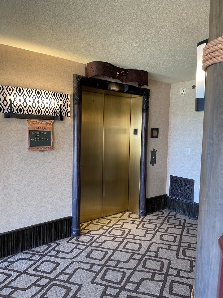 I was directed down the hallway to the only elevator, up to the 5th floor, which is the Disney Vacation Club floor, and then down another two long corridors to my room. This is where the bellman would have been a lifesaver as dragging my wheeled luggage down the three long carpeted hallways was a chore. Heck dragging me down the three hallways meant that I would definitely reach or exceed my daily step goal.