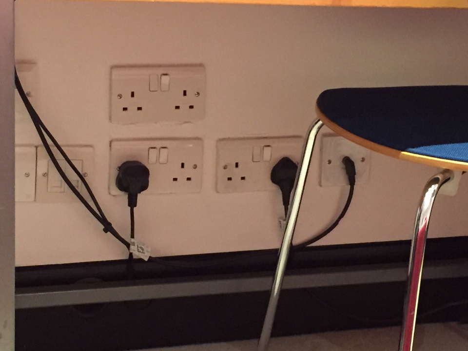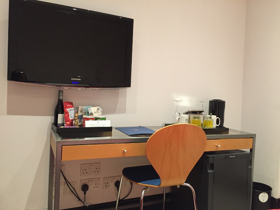 In room desk area at My Bloomsbury HotelA plethora of outlets in room at My Bloomsbury HotelMini bar snack tray had a nice selection of UK treats and familiar itemsIn room tea/coffee options at My Bloomsbury Hotel in London