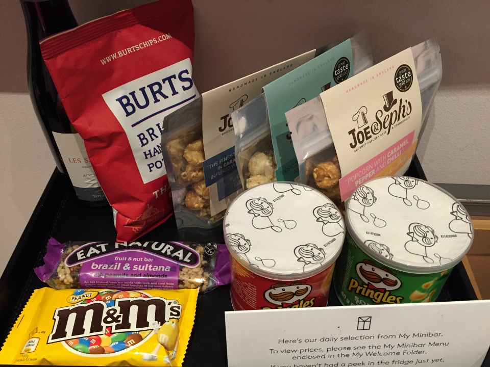 The room had a desk with more outlets than I’ve ever seen, a minibar of snacks and drinks, in room tea/coffee accessories and a wall mounted flat screen television. There were no “limited edition bespoke prints” on the wall, actually there were no prints or photos at all in the room, no black leather headboard and no “boutique” or “designer led luxury” feel to this room.