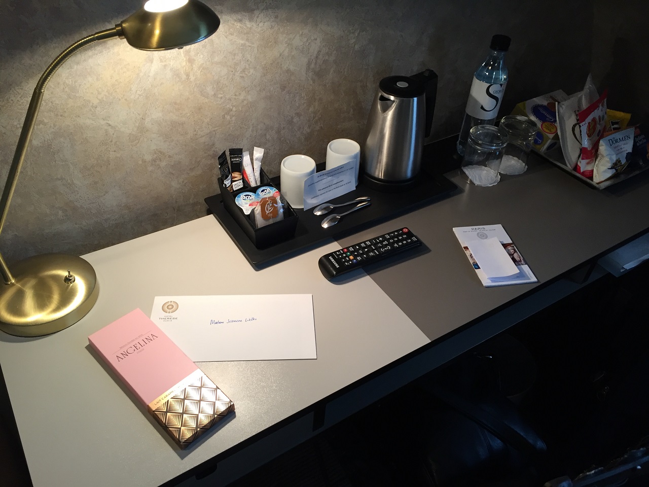 The desk contained a hand written welcome note, bottle of water and a bar of Angelina chocolate (the kind of welcome I like!) Mom doesn’t like chocolate so more for me!