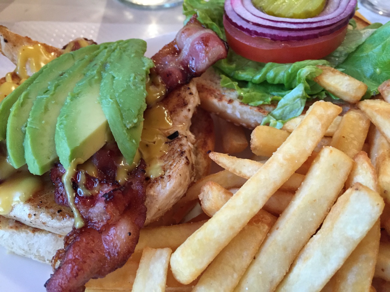 I was two months away from the U.S. having indulged in Spain, Italy and Malta so I really needed a grilled chicken sandwich and a taste of home. The menu offered me many comfort food choices (I don’t eat nachos, onion rings or mozarella sticks but you get the idea) so I added bacon and avocado to make it a healthy balance (haha!). With a side of fries and Heinz ketchup, I was a happy girl. I didn’t need to wander about in search of steak frites or other French dish, my fractured foot led me here. A chocolate brownie cake for dessert with another glass of red just made it fabulous.