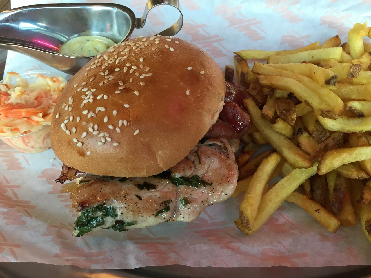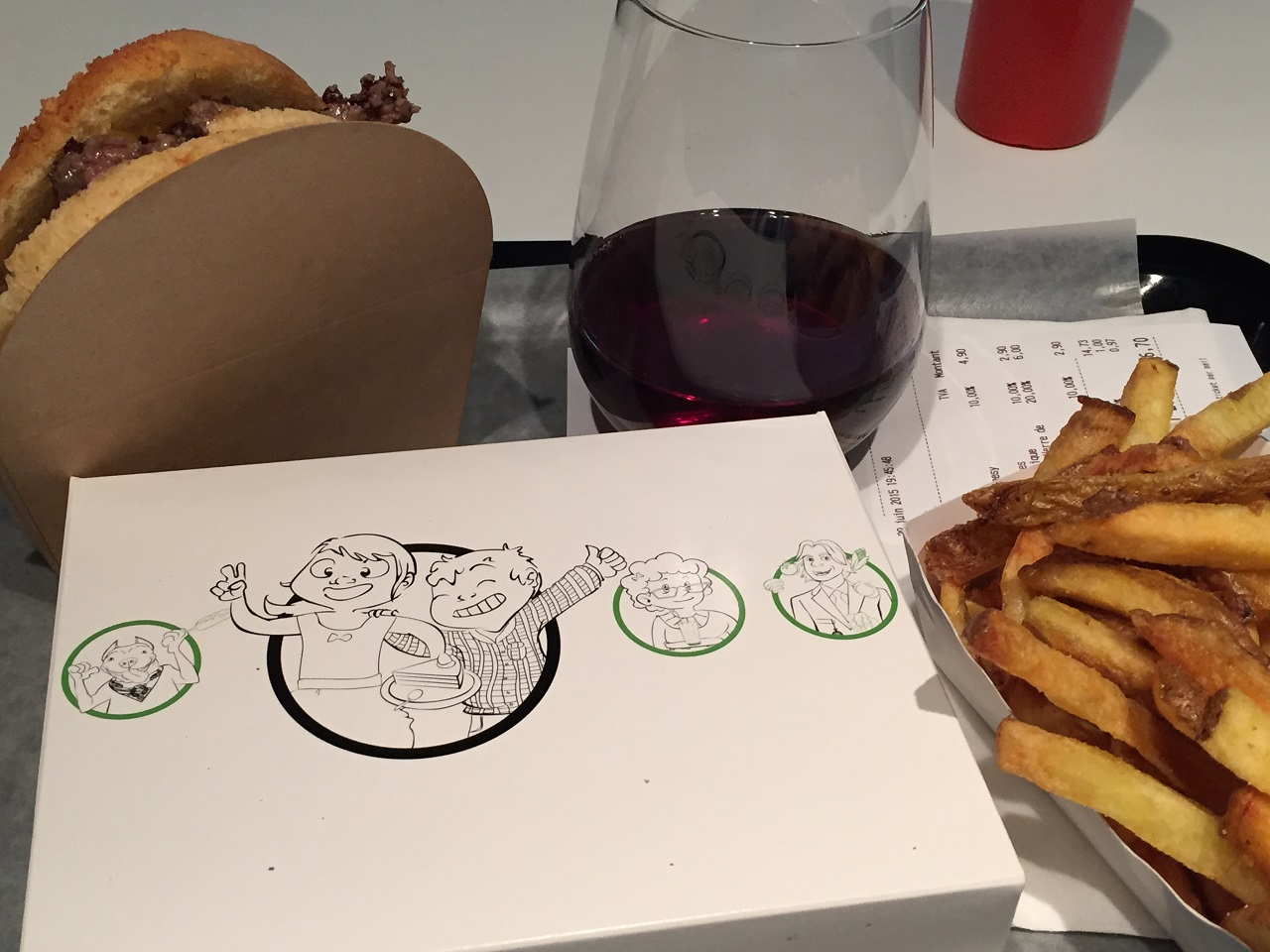 My meal cost €18.50 (burger with bacon, side of fries, glass of wine and a cookie to go)