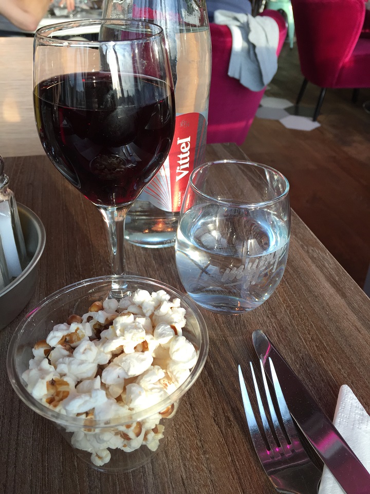 Expecting to see many tourists as the restaurant has a lovely view over the Seine, it was pretty empty on a Tuesday night. Frankly, this area of Paris, the 15th arr, doesn’t quite see the influx of tourists that the others do. The restaurant was part of the mall that included the movie theatre and M&S food market which are more neighborhood than tourist attraction. Welcomed with popcorn, I quickly ordered a glass of red wine (my American diner doesn’t serve wine) but had to sit with my back to the Seine due to the strong sunlight streaming in (a few people in the know, speaking French, were wearing sunglasses at the table and only in Paris does this seem ok to do).