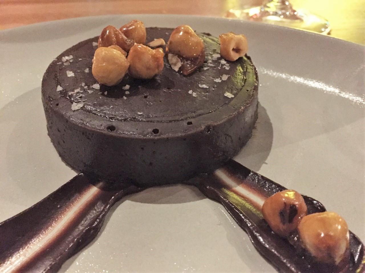 I was going to pass on dessert (the gluttony and diet deviation was already bad) but she didn’t want to dessert alone and who am I to pass up chocolate? I had two interesting choices – the chocolate bon bons (six truffle like chocolates in flavors like lemon, raspberry, mint, hazelnut and two other flavors) or the chocolate sea salted whiskey ganache cake with hazelnuts (go ahead read that again to let it sink in).