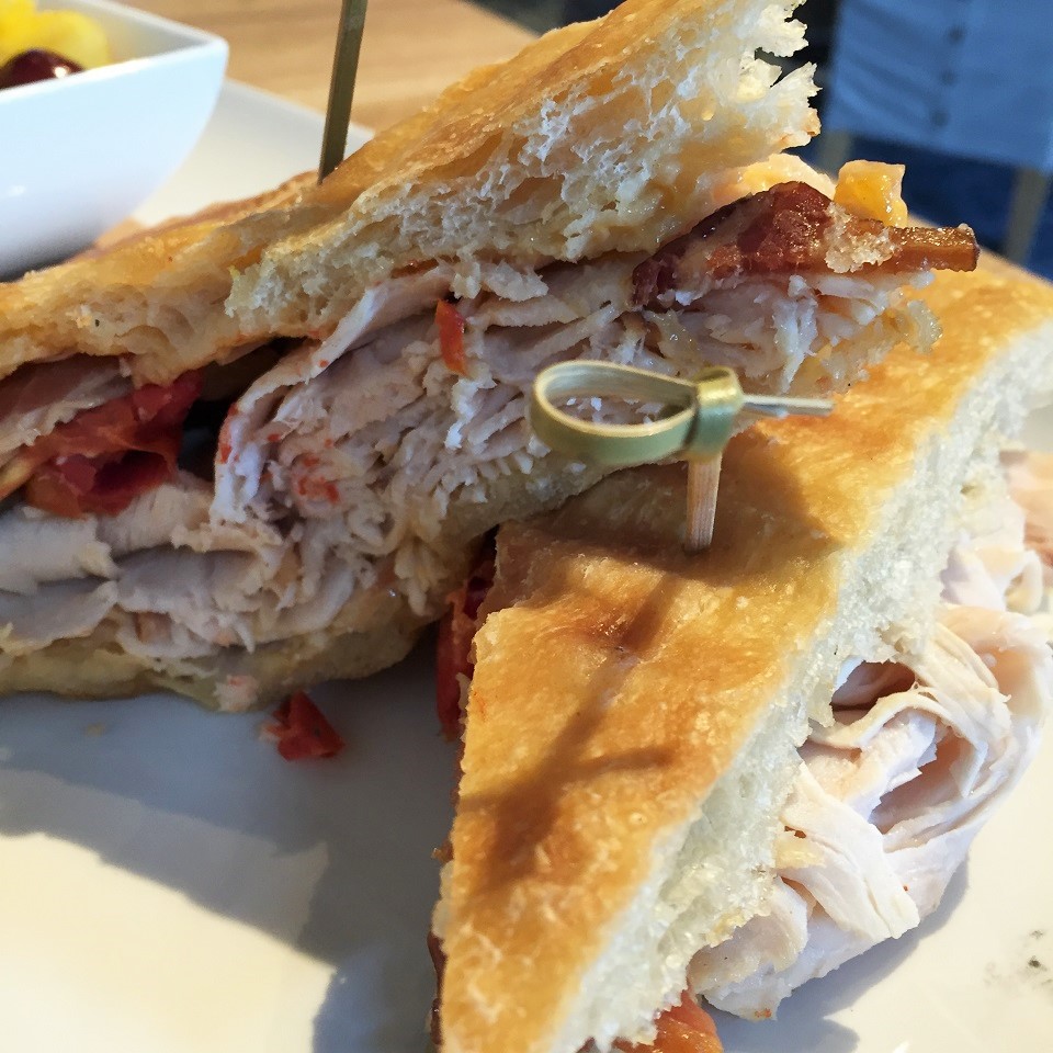 Photos from lunch – my friend ordered the deviled eggs, a turkey panini with a side of fruit and the chocolate whiskey cake. I ordered a grilled chicken sandwich with bacon and fresh avocado side of fries. Sadly, there is no cornbread at lunch.