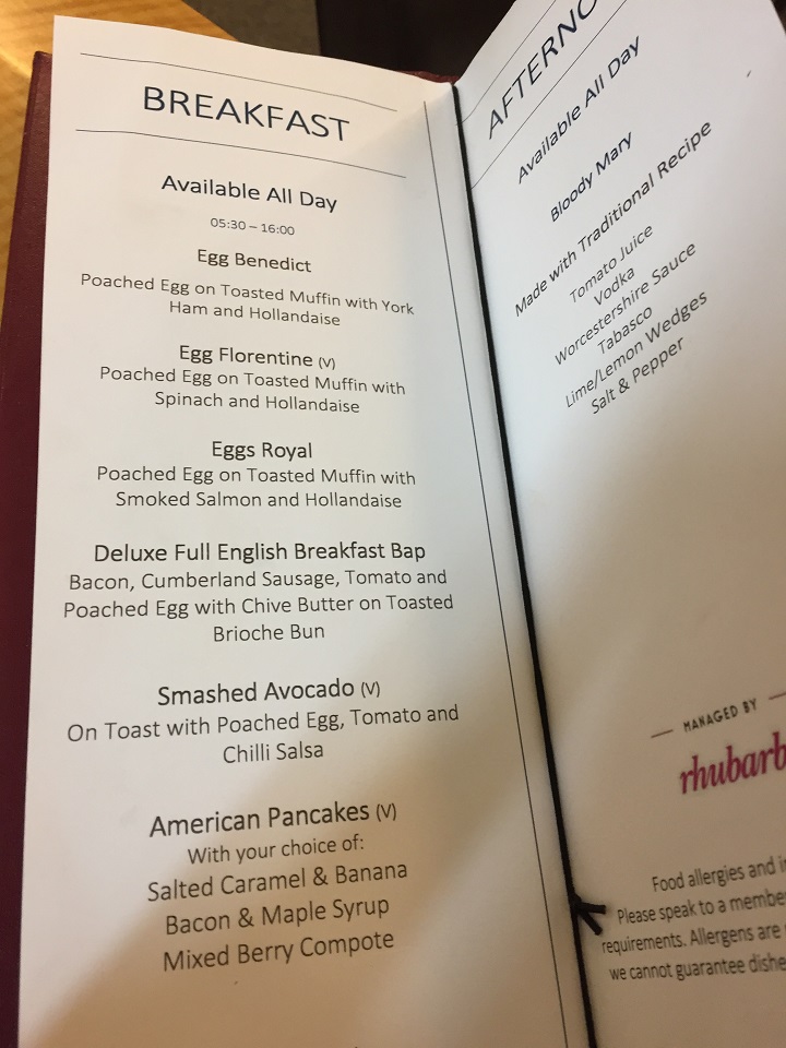 The all-day dining area had a separate server to oversee guests. The menu was American breakfast all day (eggs, avocado toast and pancakes, etc.) as well as a full English breakfast option and I will say I was tempted by the pancakes since I was away over two weeks eating eggs every day. I did think it was a bit weird though to be in a First Class lounge and the menu was breakfast. By comparison the British Airways Concorde Lounge has a breakfast, lunch and dinner menu available with various selections.