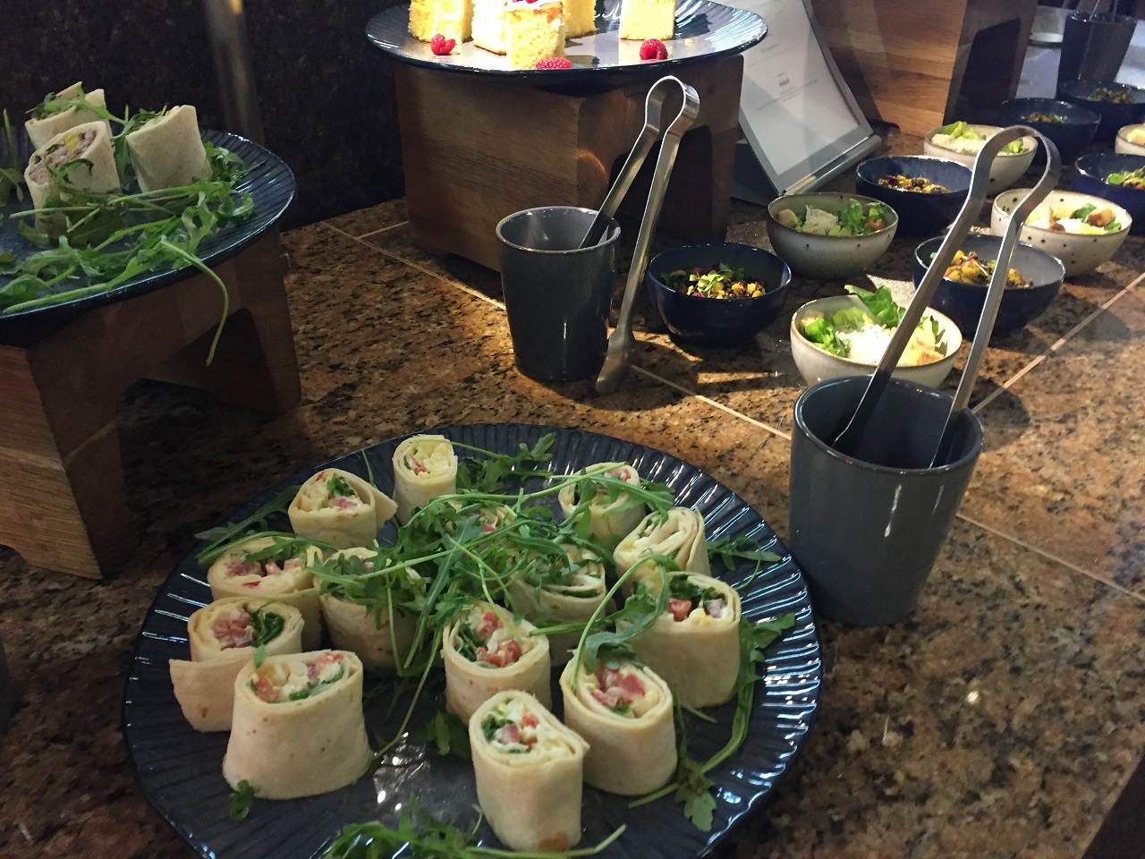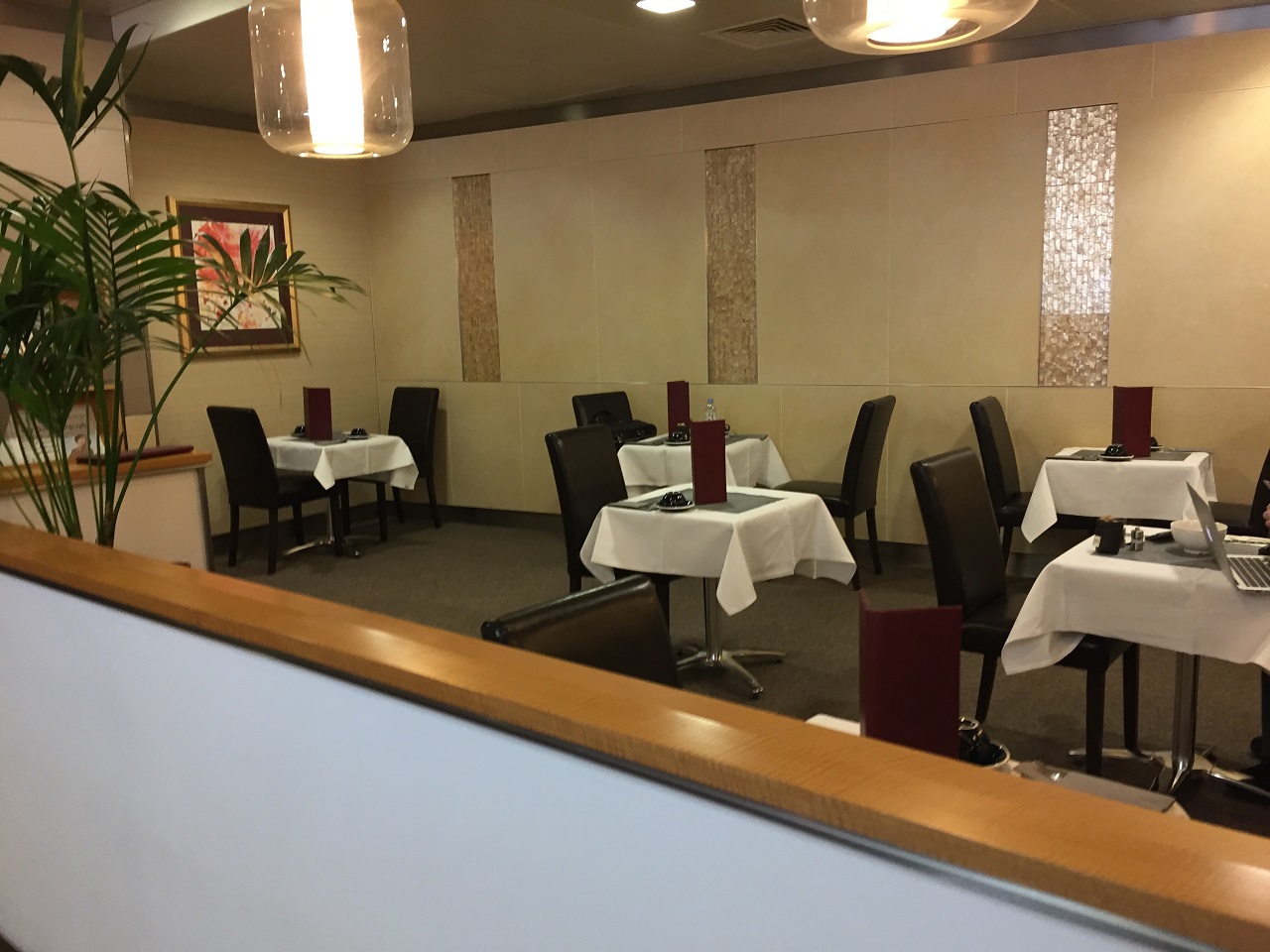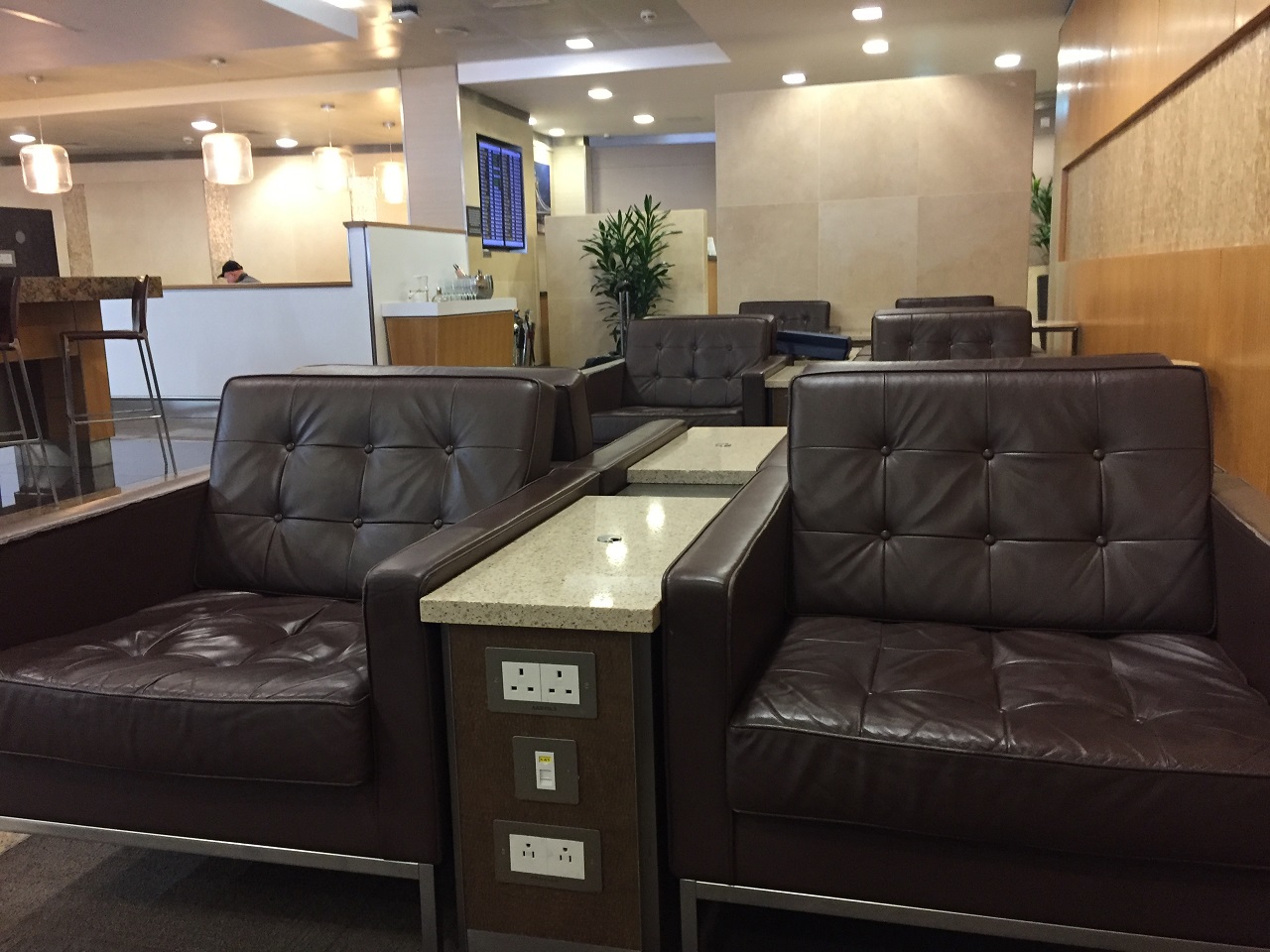 The lounge isn’t fancy or massive but a nice size that it never felt crowded. Standing at the champagne, there are seats arranged two by two in groups of four on your left, straight ahead up a few stairs is an open platform of seating options, on the right behind the wall is all day breakfast in the dining area and in between all the areas is the kitchen with drinks and food. The brown leather was definitely dated and didn’t quite have the feel or the allure of a first class lounge.