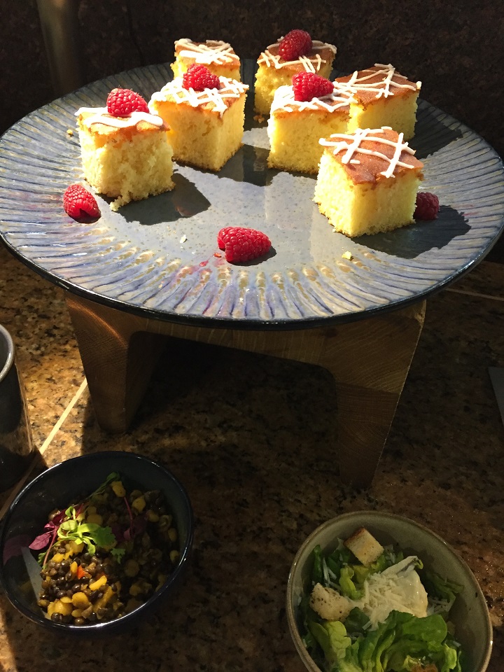 The kitchen area similar to your work lunchroom setup probably – had two food setups – hot bar and cold bar – as well as a drinks and snack area. For lunch this day, there was chicken tiki masala, rice and a vegetarian pasta. On the cold bar – salad and prepared sandwiches. The dessert included chocolate tart and cake cubes.