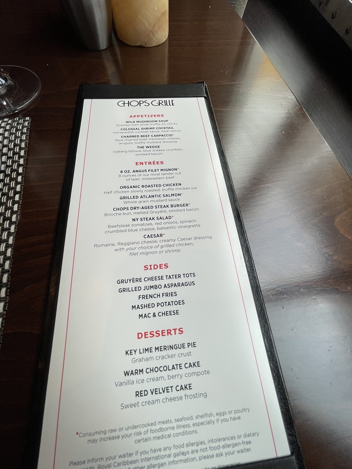 Insider Tip – Royal Caribbean Specialty Restaurants – Watch for sales to save money over standard costs. You can cancel the original booking and rebook at the lower price. Lunch menu items are smaller portions for less than the dinner costs. You get the same experience with less crowds and can enjoy savings. Chops Grille is open for lunch only on sea days.