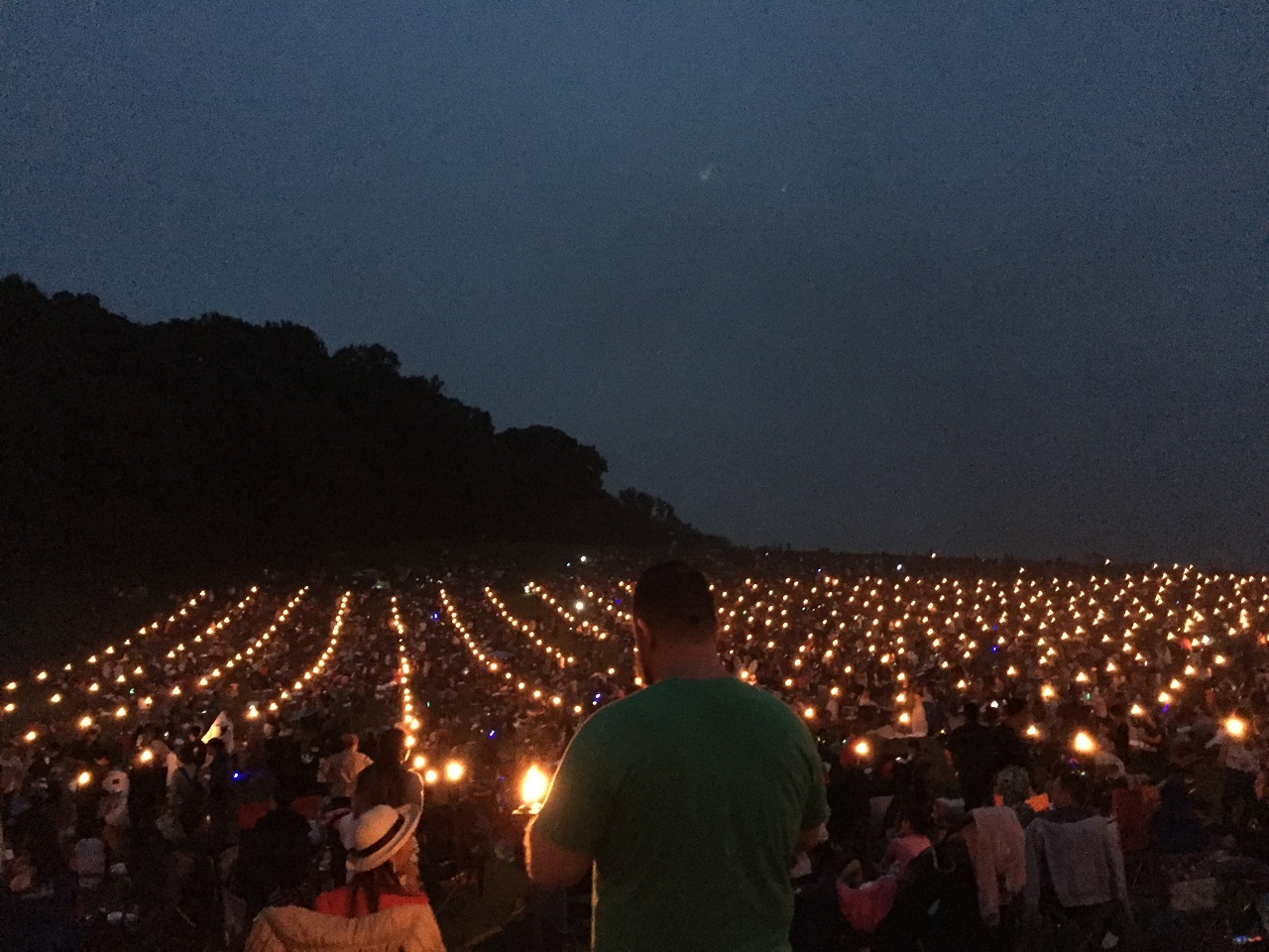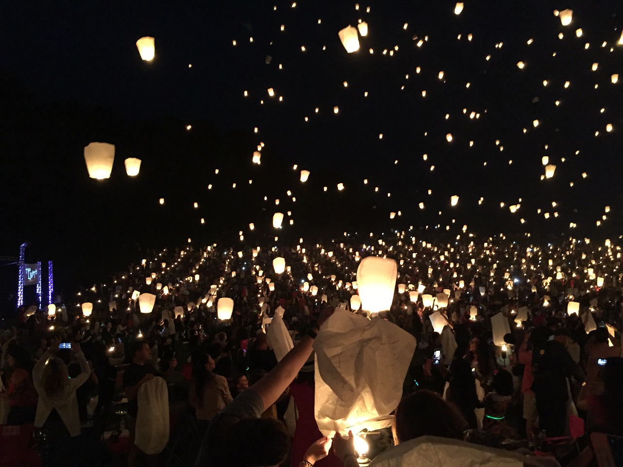 Once we did get the “all clear”, it became interesting. 3,000+ people don’t always follow directions or execute the same. A few folks didn’t wait until the entire bottom was aglow with fire so their lanterns quickly fell to the ground and started small fires that had to be stepped on or doused with water bottles. The two man process was a test of patience because two minutes is longer than you imagine trying to get the bottom lit with the torch fire. Once the lantern felt a bit full we started letting go and watching the field of lanterns gently and slowly float into the night sky. Many would travel to the adjacent field (the targeted landing spot) and fizzle out. As for the others, the wind wasn’t carrying them too far so I’m not sure where my hopes and dreams written on the lantern drifted to or fell.