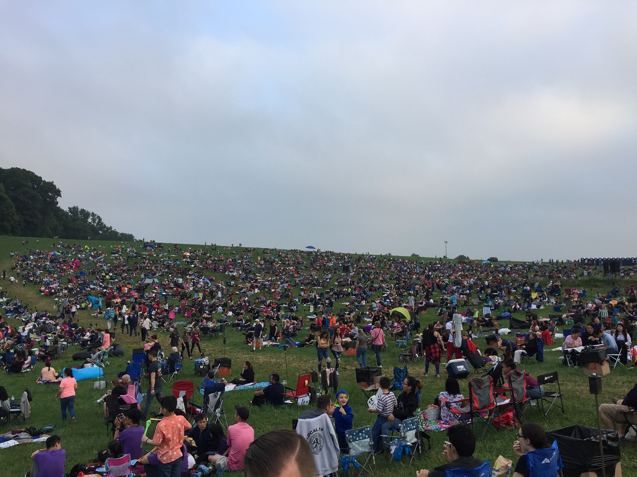 In the distance by the row of porta potties, there were long lines for the six food trucks. Given the waits of the people walking with food (nearly an hour), I’d suggest packing your own picnic like we had and so many others had done. Six food trucks and nearly 3,000 people? Definitely not enough to count on. There were enough porta potties so the wait was minimal. Do bring a flashlight with you as the tiki torches only light the launch area, the surrounding common walkways, porta potties and fields were dark and uneven terrain.