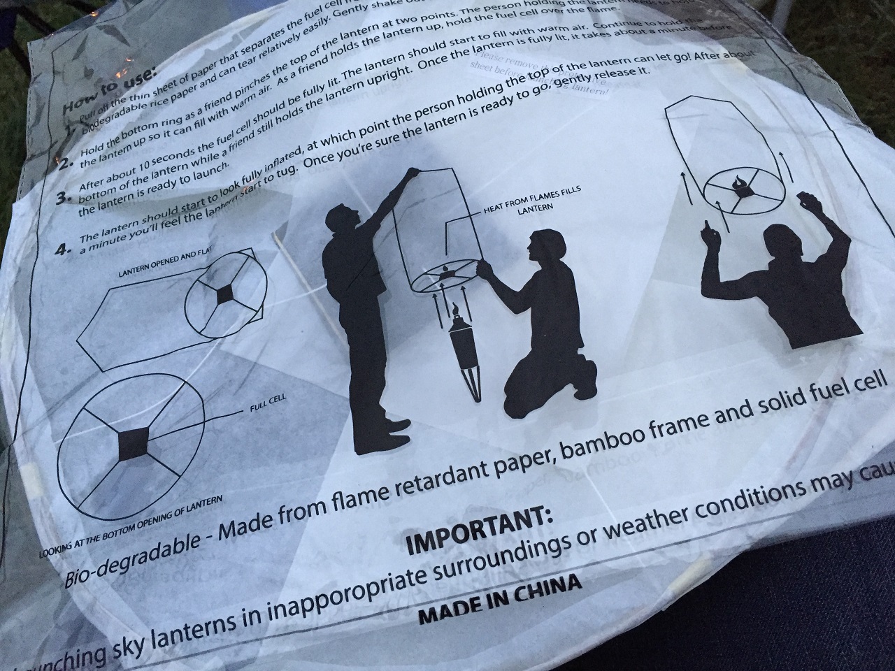 Walking through the knee high grasses to the ankle high grass field we checked in and received our rice paper lantern bag (with instructions printed) and a bag containing a pen and wristband. The large field was portioned out by tiki torches not yet lit in rows and aisles. At the bottom of the hill was a stage with an acoustic musician singing popular songs with some children dancing in front of the stage. Our friends had arrived earlier than we had and found a square flanked by four torches on the corners to call their own. They set up a table with foods and a blanket on the ground. Maria and I brought our chairs and more foods to enjoy.