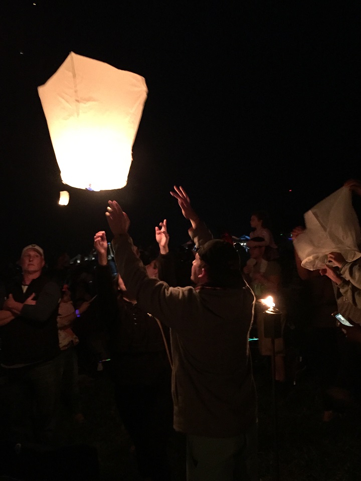 With the torches lit throughout the field and the speaker on the stage to demonstrate what to do, there was the stray lantern lit ahead of time and sent up into the dark night that elicited a rousing “boo” from the crowd as the fire captain didn’t give the go ahead yet.