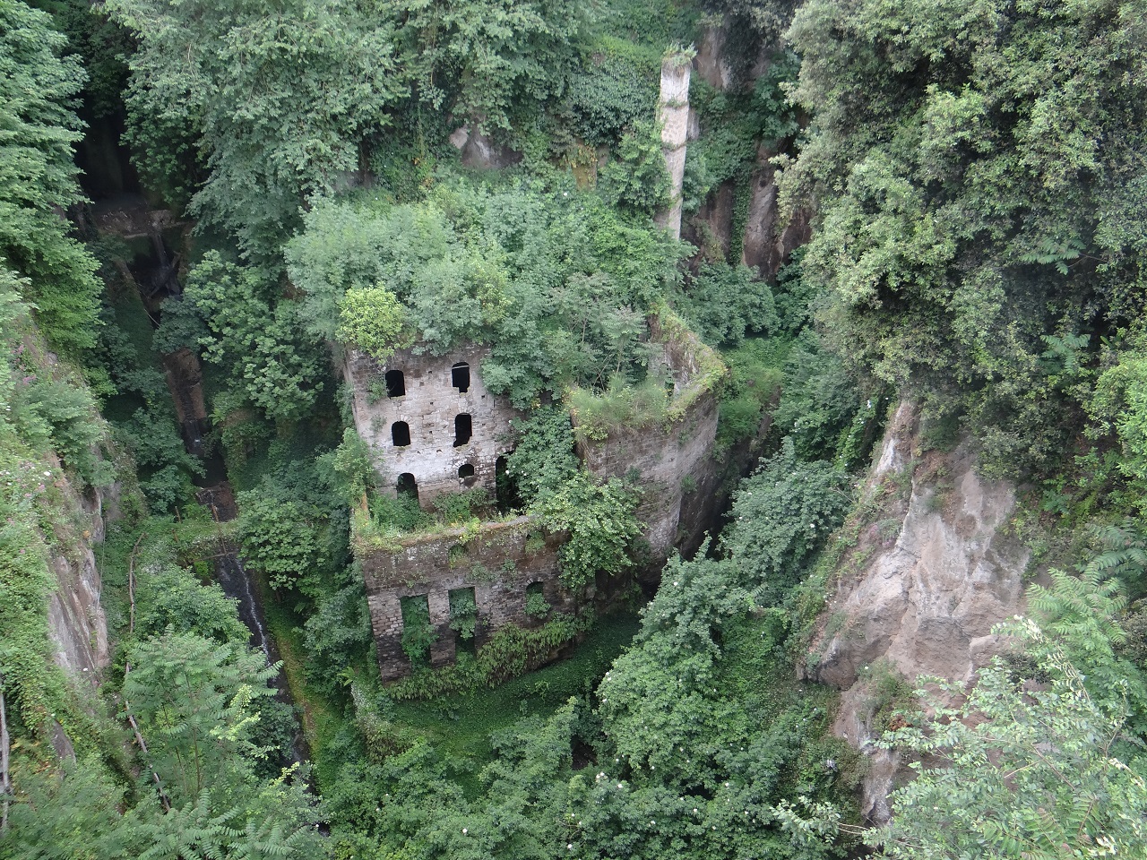On the way back to the city, we were now past the center of town (Piazza Tasso) looking down while people passed by. Many folks walk past this historic site on the way to the souvenir shops not knowing that Marcello and his friends used to run down the steps and play in the Deep Valley of the Mills (Il Vallone dei Mulini). It was an old flour mill with water coming from the mountains. If you look closely on the left on the side of the wall you can see the perilous steps without a railing (yikes!).