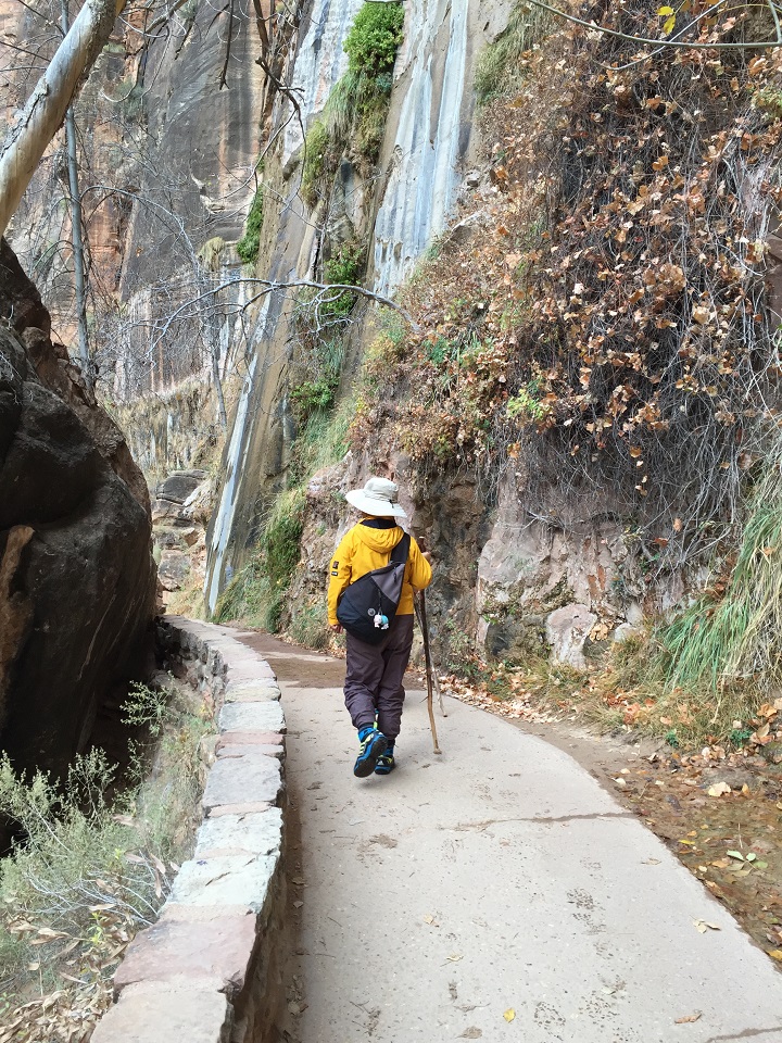 Visiting Zion National Park is easy to do for travelers of all ages and activity levels. There are two paved accessible paths at Zion that are lovely walks and easy to do with fantastic sights. I had planned on doing more intensive hiking at the park but was waylaid by two injuries sustained at my Red Mountain Resort Spa escape – naming a wonky big toe on my right foot and a hamstring injury on my left leg. So I was hobbling slowly by the time I made it to Zion Lodge in Zion National Park. Luckily, Zion offers a range of hiking options so I chose to start with the Riverside Walk (2.2 miles, 1.5 hrs.) which leads to the Narrows Hike for those with water gear and a few hours (8+ hours for the 9.4 mile trek). The Riverside Walk is at the end of the Scenic Drive and shuttle stop #9.