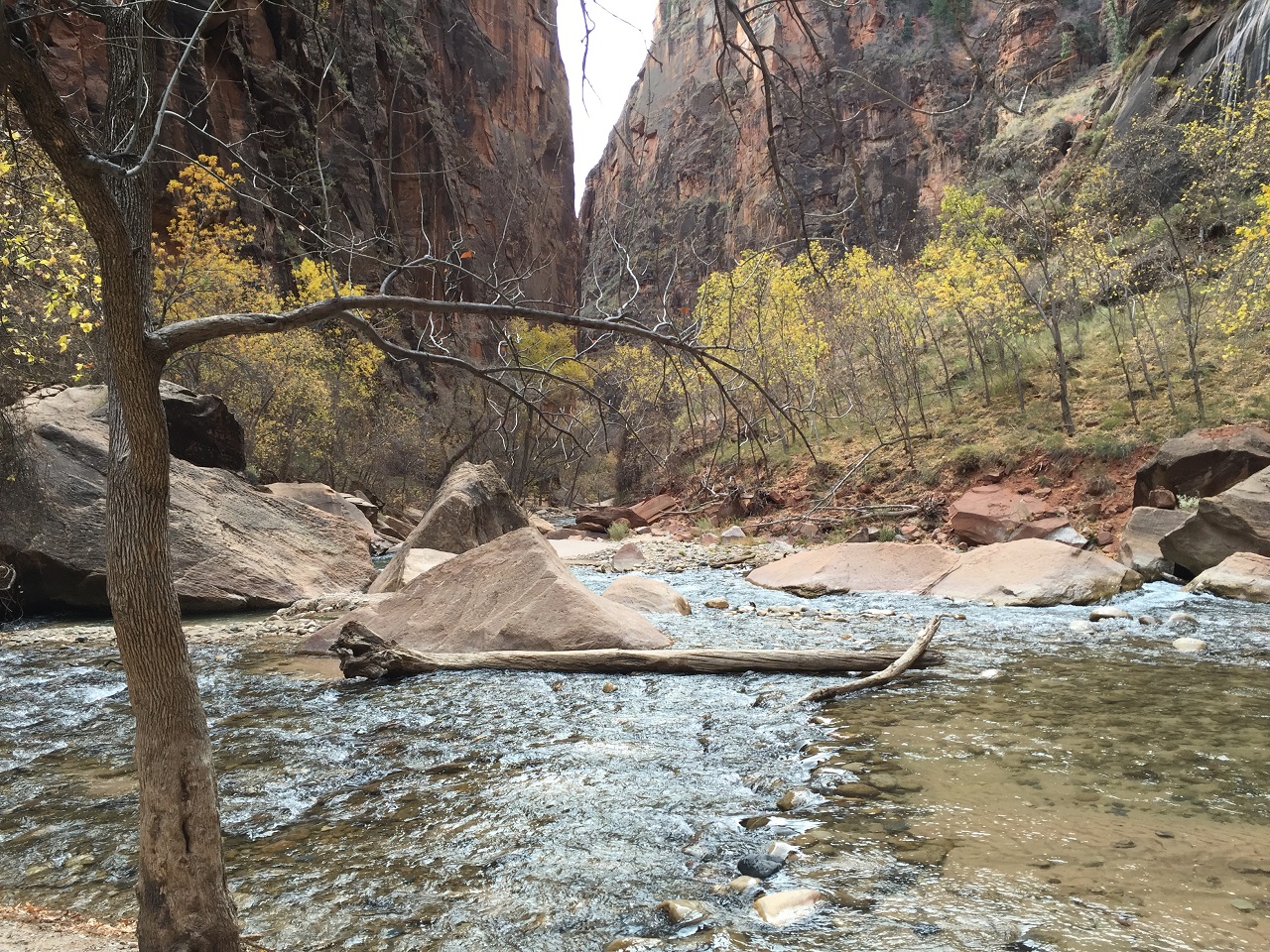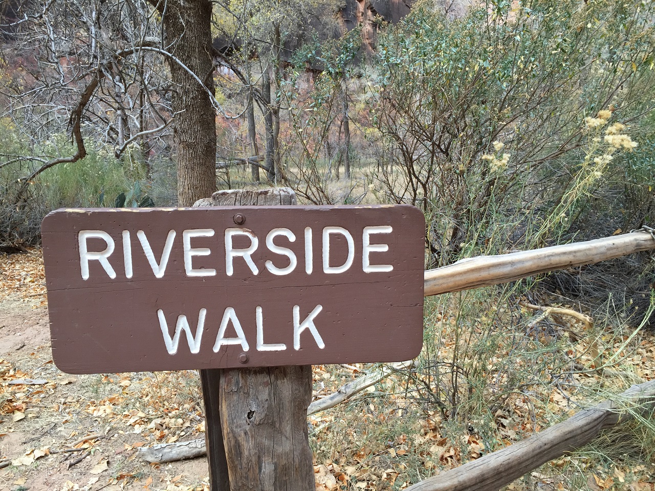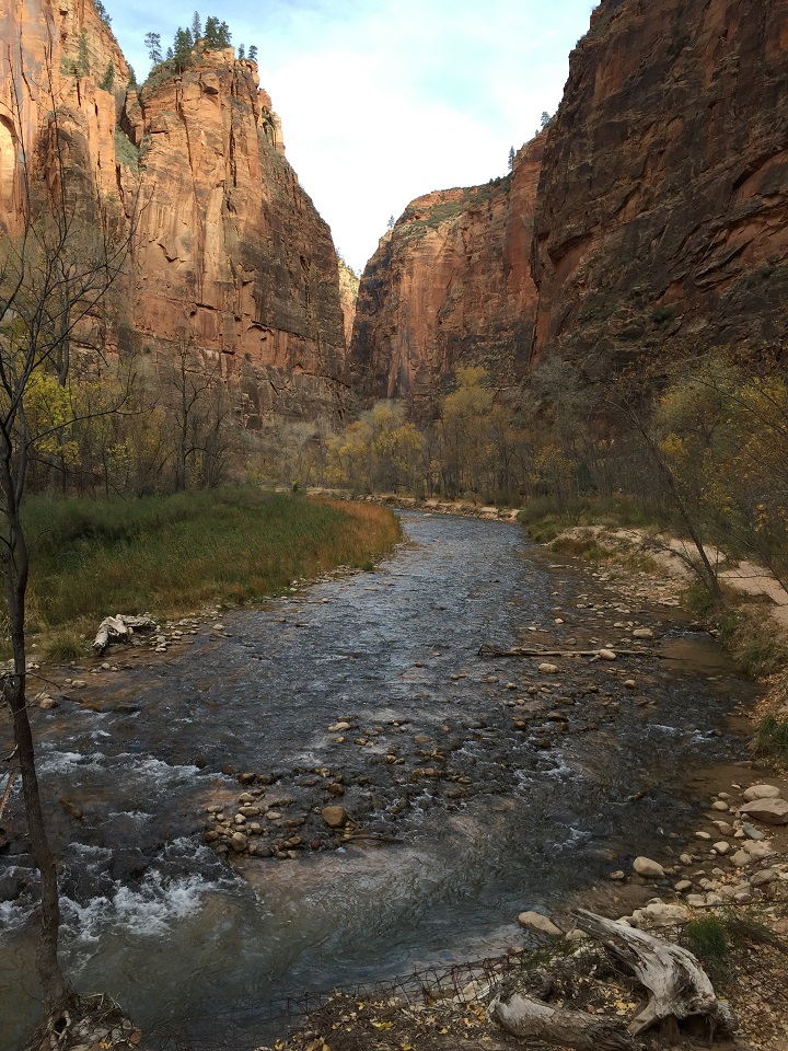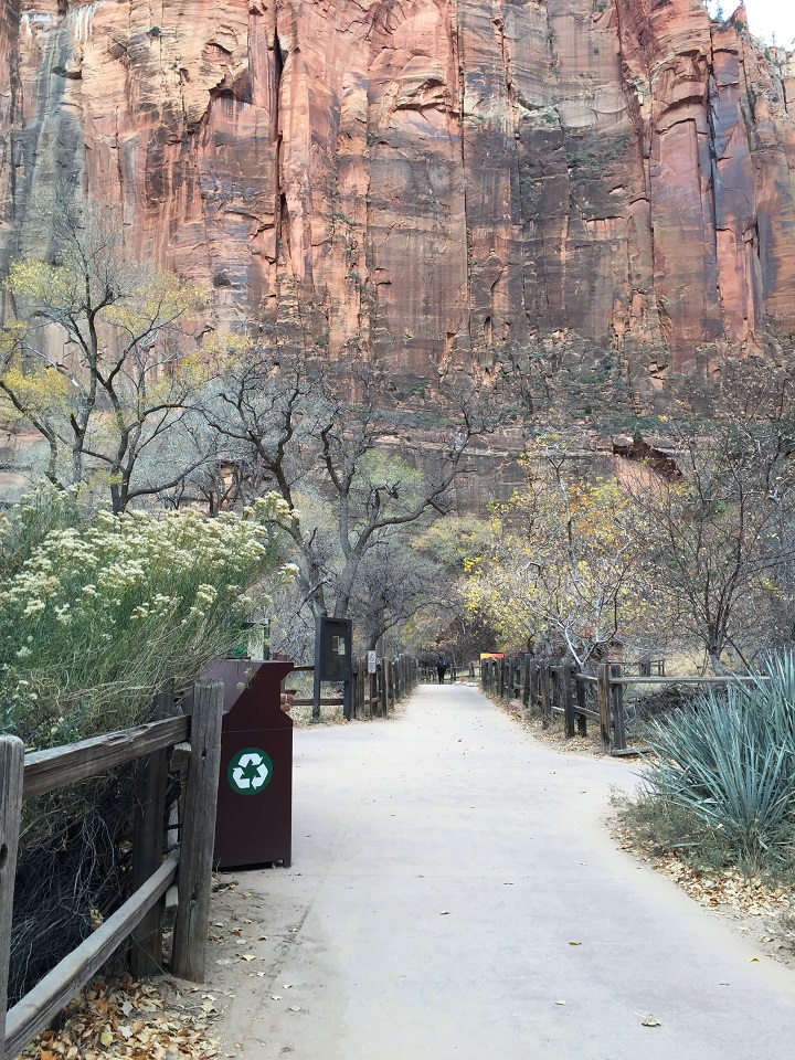Parking for the Riverside Walk and The Narrows was easy at 9 a.m. on a November Thursday, however, by 10:30 a.m., the lot was full. Generally, this location is served by shuttle bus during busy season. When the shuttle isn’t running, the Park Service will close the Scenic Drive when parking is full so I’d recommend an early start to get that coveted parking space.
