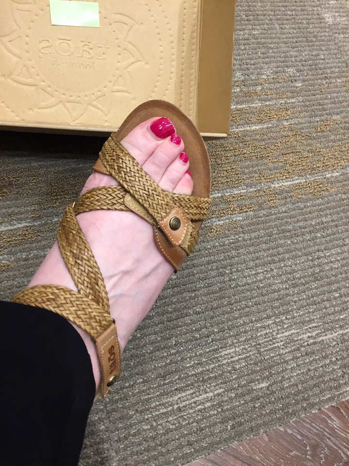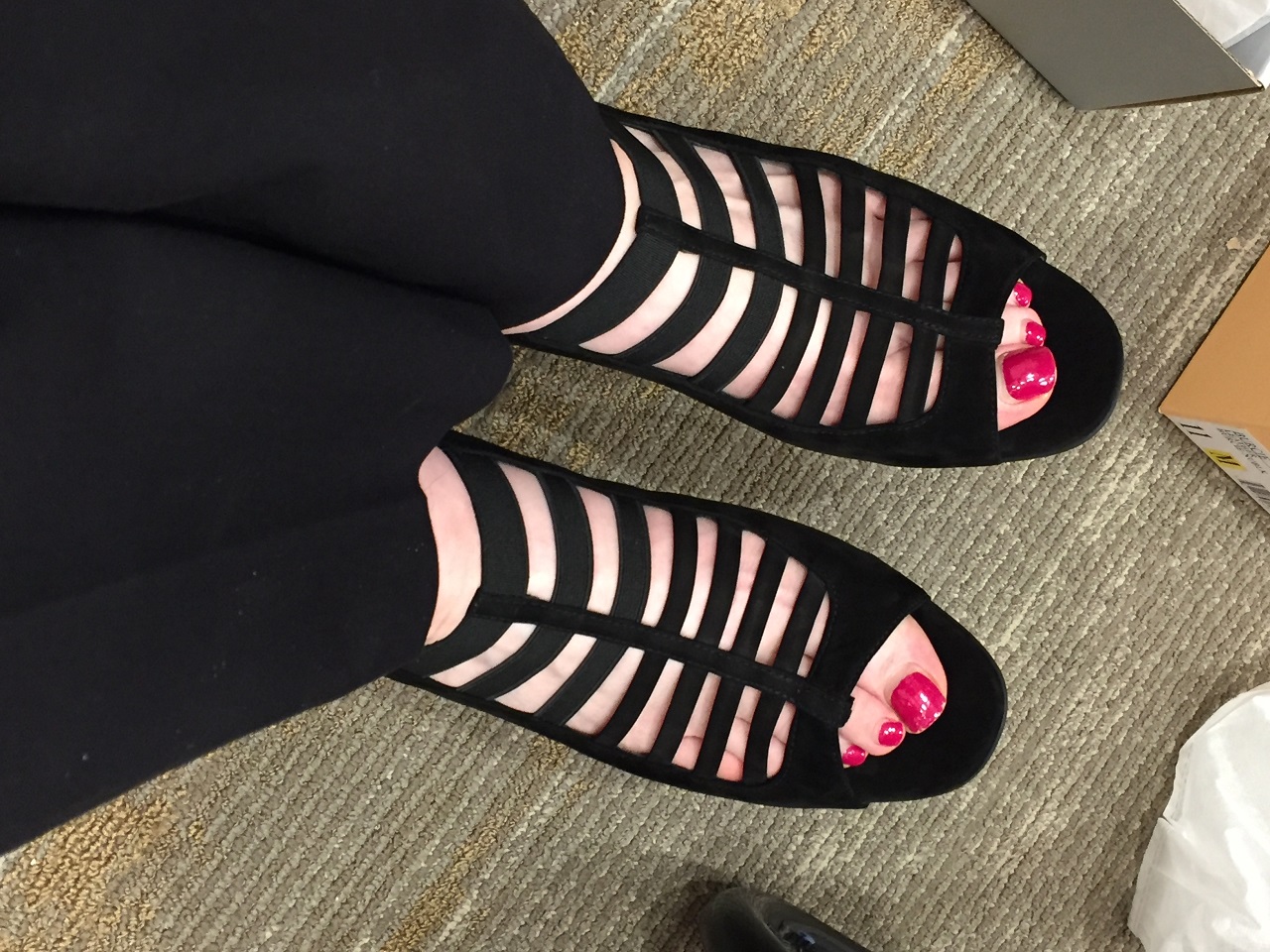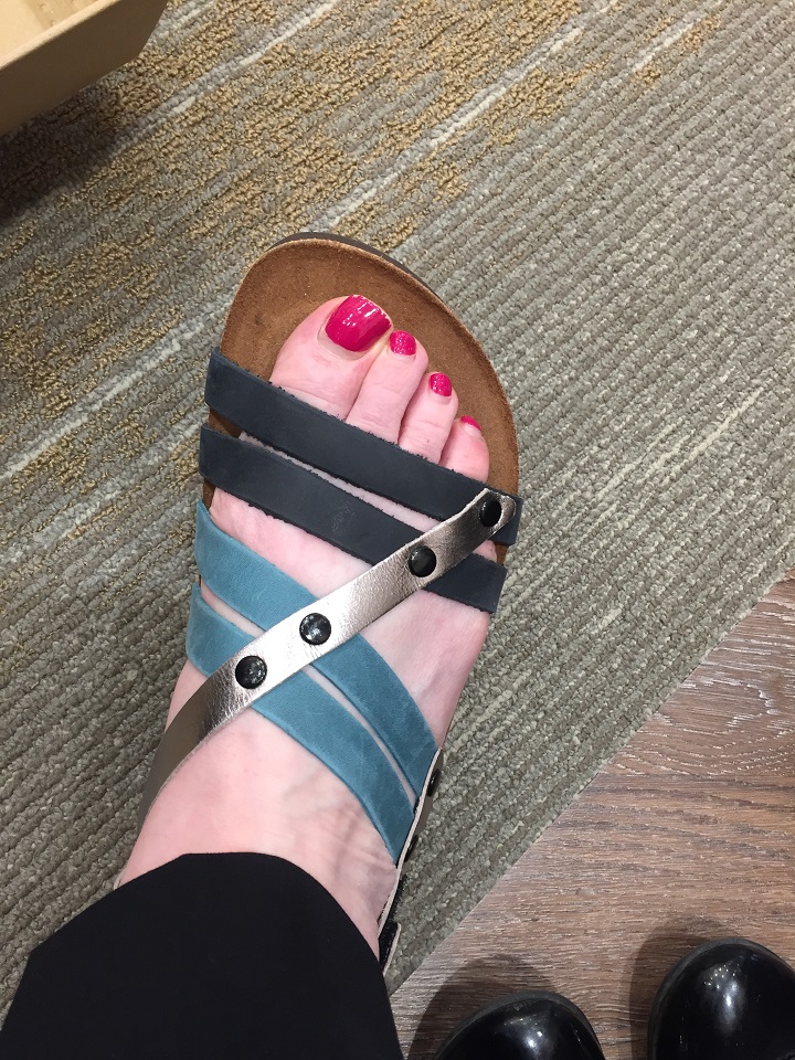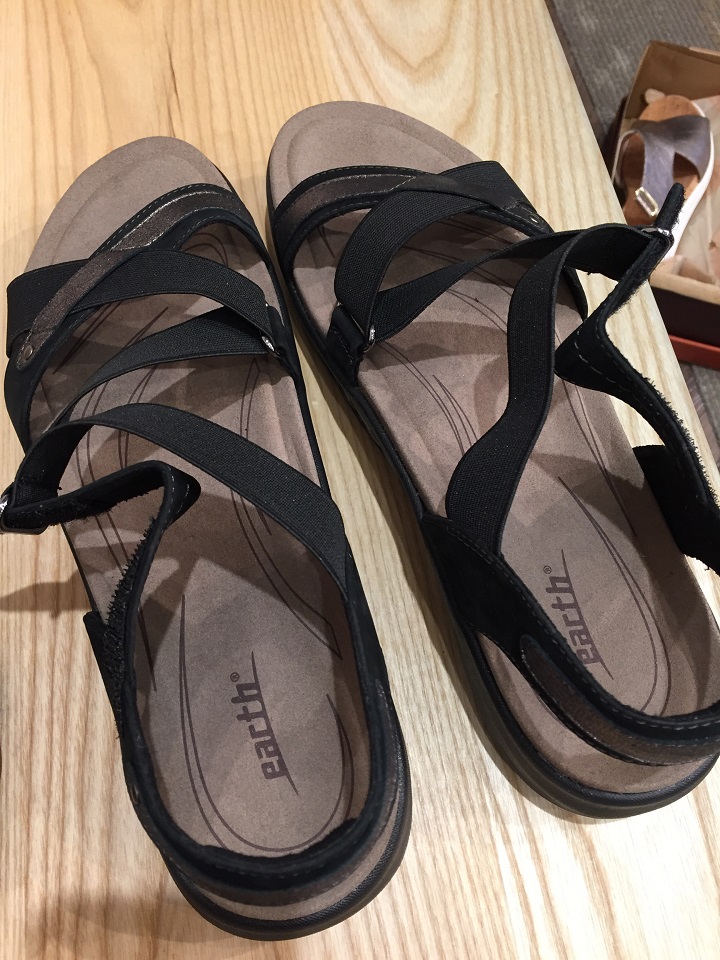 Of the more than ten pair of shoes that I tried on, I managed to narrow the selection down to three contenders. I then had to consider my travel needs for walking and with that the winner was Earth Shoes! The black (of course) sandals had arch support that felt weird at first because my shoes I wore into the store did not have the support. The shoes could be adjusted with the Velcro closure (always good for when your feet might swell in the heat) and had good traction on the soles plus a bit of sparkle in the top band. As the company plants a tree which each sale, I could feel good about my shoes.
