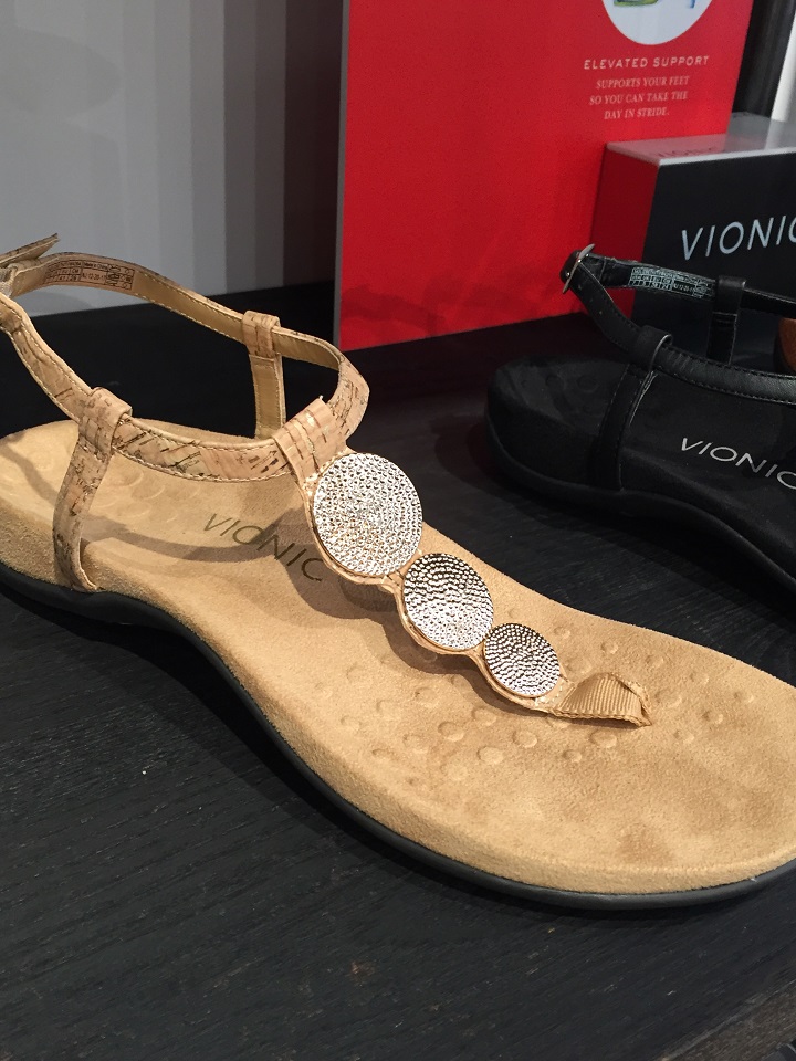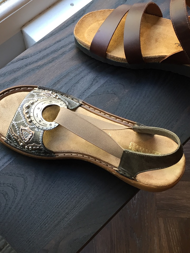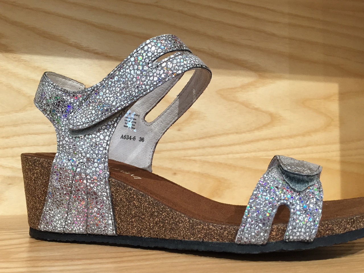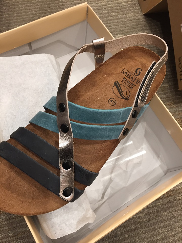 Of the more than ten pair of shoes that I tried on, I managed to narrow the selection down to three contenders. I then had to consider my travel needs for walking and with that the winner was Earth Shoes! The black (of course) sandals had arch support that felt weird at first because my shoes I wore into the store did not have the support. The shoes could be adjusted with the Velcro closure (always good for when your feet might swell in the heat) and had good traction on the soles plus a bit of sparkle in the top band. As the company plants a tree which each sale, I could feel good about my shoes.