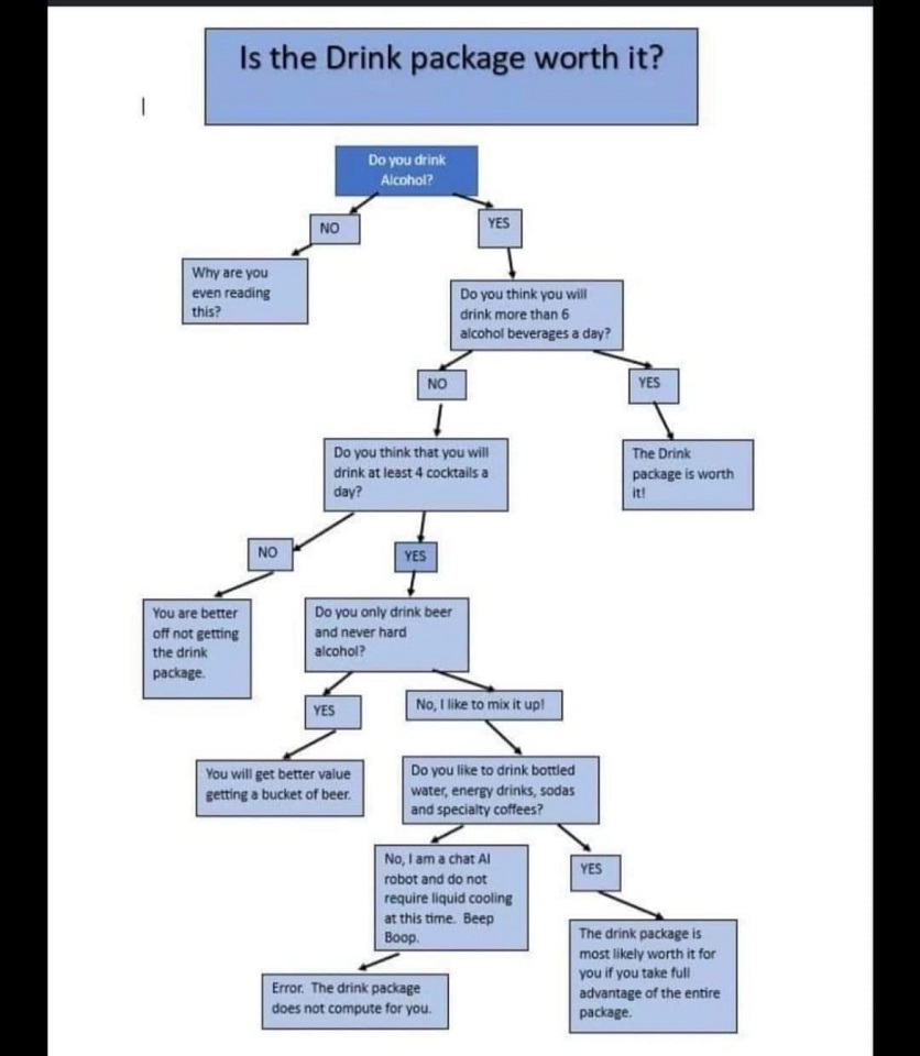 Cruise lines make money on those drinks’ packages, pricing of which varies but can often add $500-1,200+ to the cruise price depending on the length of the cruise and if you stay at the basic beverage package or upgrade to premium. If you prefer a certain brand of liquor knowing if that’s in the basic or premium package matters. Which is why folks want to know which brand of water is served on a cruise ship. Bottled water generally runs $3-$6 a bottle and surprisingly is included in the “premium” higher priced beverage package. This might not be a big deal to most folks but if you don’t drink enough alcohol and specialty drinks to justify a drinks package or maybe you just don’t drink for a variety of reasons asking about the bottled water package is a fair question. Here’s a fun flowchart to know if the cruise ship beverage package is worth buying?