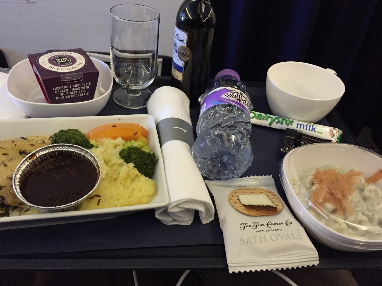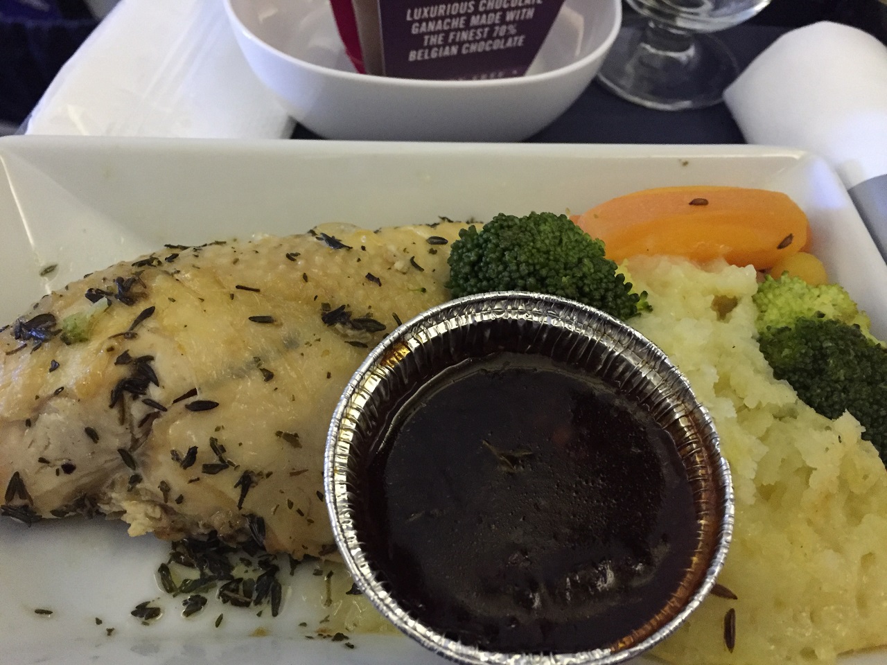 On the flight home, the meal (starter, entrée, dessert) was served in one shot on one tray. I chose the chicken over the pasta in cream sauce. Surprisingly the chicken was pretty good, not Chicken Shop amazing, but for airplane food good. The wine was also served as either red or white and in a little bottle. No worries, I paired the red with the chocolate pot and did ok (I did miss the anytime Club Kitchen with the extra chocolates, desserts, wine refills, etc.).