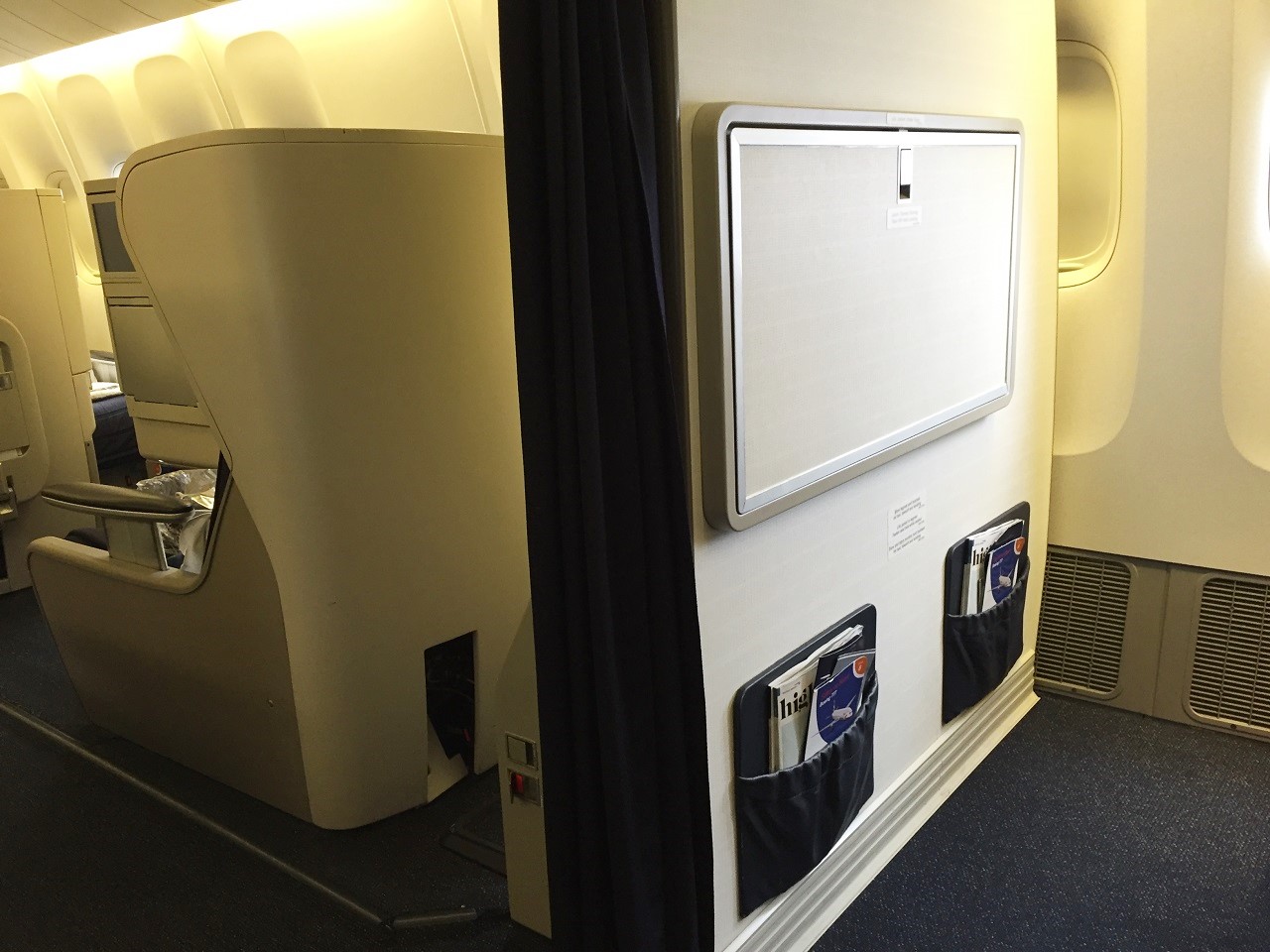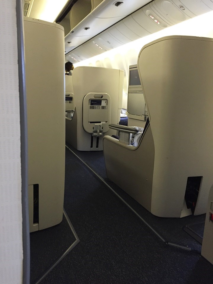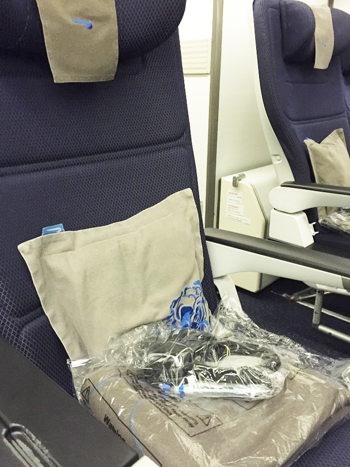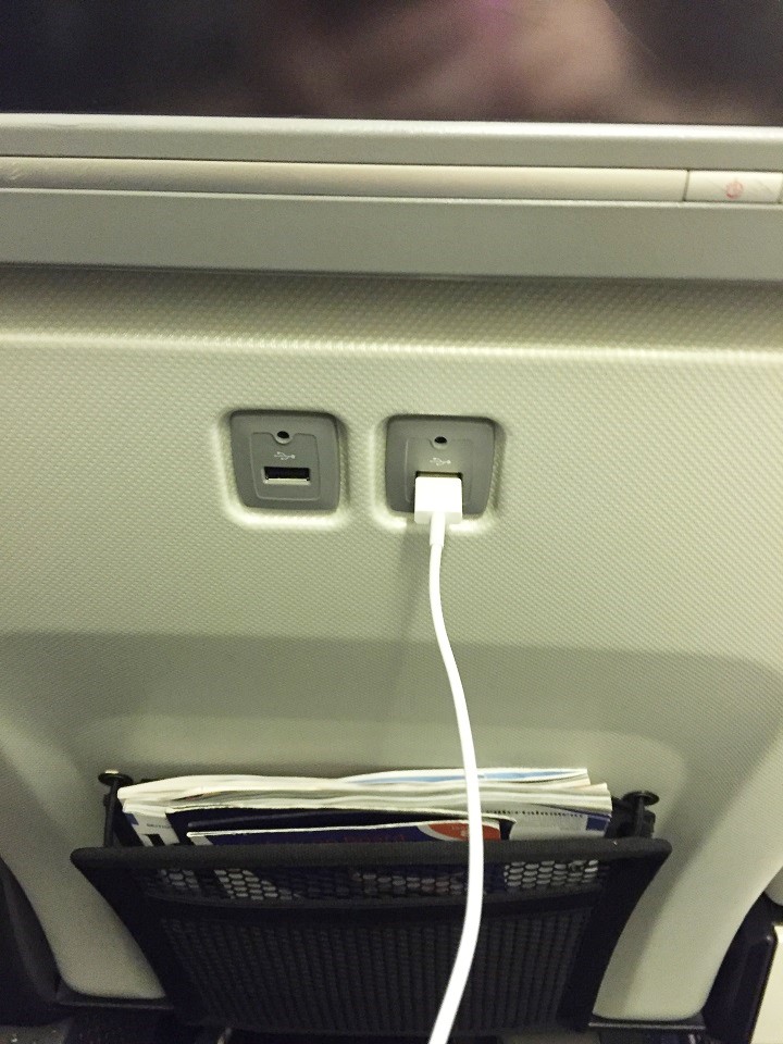 The cabin is organized 2-4-2 with five rows accommodating 40 passengers with curtains closed to Club World in front and World Traveller in back. When you first arrive at your seat in the cabin it seems private with such a small group. The seat has a pillow, blanket and headsets. There is an in seat charger as well as two USB ports in the seatback in front of you, below the entertainment screen. Once you are seated, you can feel the different with the extra legroom and the open side of the seat (the middle armrest is hard seat with the remote, shared table and other functions set in).