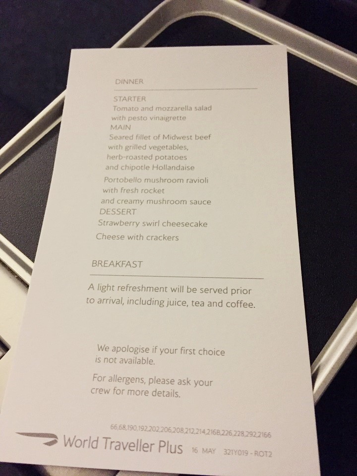 While normally, I’d order my special meal on British Airways (low calorie which practically ensures chicken and veg) and bring my own food as backup, this time hoping that full flights would bump me up a class, I decided to forgo my special meal as I’d read that they won’t upgrade you if they loaded a special meal (not sure if this is true or not). Unfortunately, World Traveller Plus doesn’t get the variety of choice like you do upfront (Business and First Class usually have a menu with at least three entrée choices). I did get a printed menu with the food being served. For the overnight flight to London, I skipped the food (beef or pasta) and drinks as it was near 11:30 pm when they started service and I had indulged in Chickie’s & Pete’s (a Philly local favorite) at the airport.