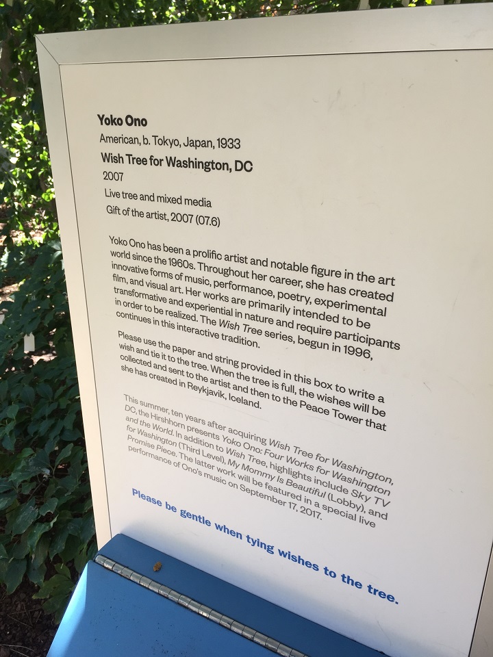 Modern art and I have a love/hate relationship since my visit to the Chicago Art Institute which threw me over the edge. Yoko Ono’s art over the years has been controversial for me so when I heard about the Wish Tree for Washington, DC, I was curious. How is a living tree a work of art? I have a yard full of trees and no one has deemed them art or offered to move them to a museum. But frankly, I let that go as I wanted to believe that the art and the tree were magic and that wishes could come true. I had a wish to make!