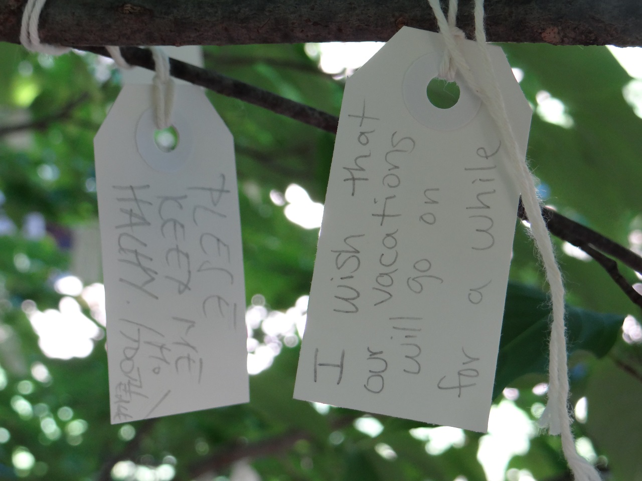 Wishes of world peace, of sibling peace and political peace. Wishes for pots of gold and lottery wins. Wishes for stuffed animals and candy and for her little brother to stop being annoying. Wishes for happy marriages, graduations, new jobs, new relationships and new lives. Wishes for love, happiness and smiles. Wishes for good health and vacations that never end. Everyone that walked by the tree stopped to write down a wish.