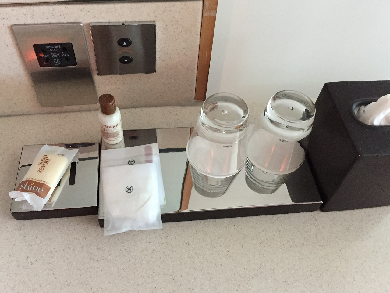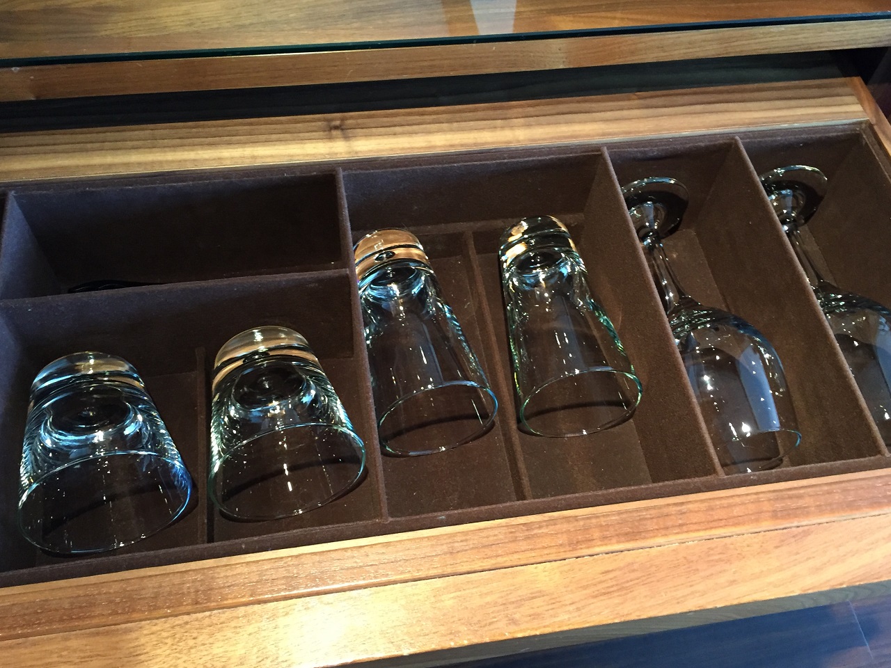 On the left, I had the master room switches, closets of storage (plus slippers and robes) and drawers for the minibar and coffee maker. Impressive was the drawer of glasses similarly featured as they are at the Westin Sydney. So obviously the designers are borrowing cool features from other hotels.