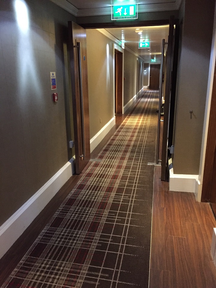 The elevators require a key swipe to access guest sleeping floors. I would be on the 6th floor of the seven story hotel. My room was close to the elevator bank (four rooms away) but I was only bothered by noise on one morning as loud people were walking by. The hallway rug was a relaxing brown plaid, an ode to the kilt.