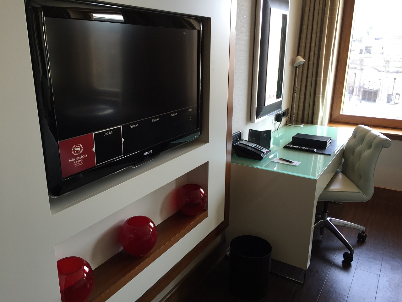 As I entered the room, it was definitely surprising in a good way. My Sheraton expectations were definitely exceeded just like in London at the Sheraton Grand London Park Lane. The Edinburgh Sheraton room had wooden floors, a rug feature around the bed and a view of the castle up on the hill.