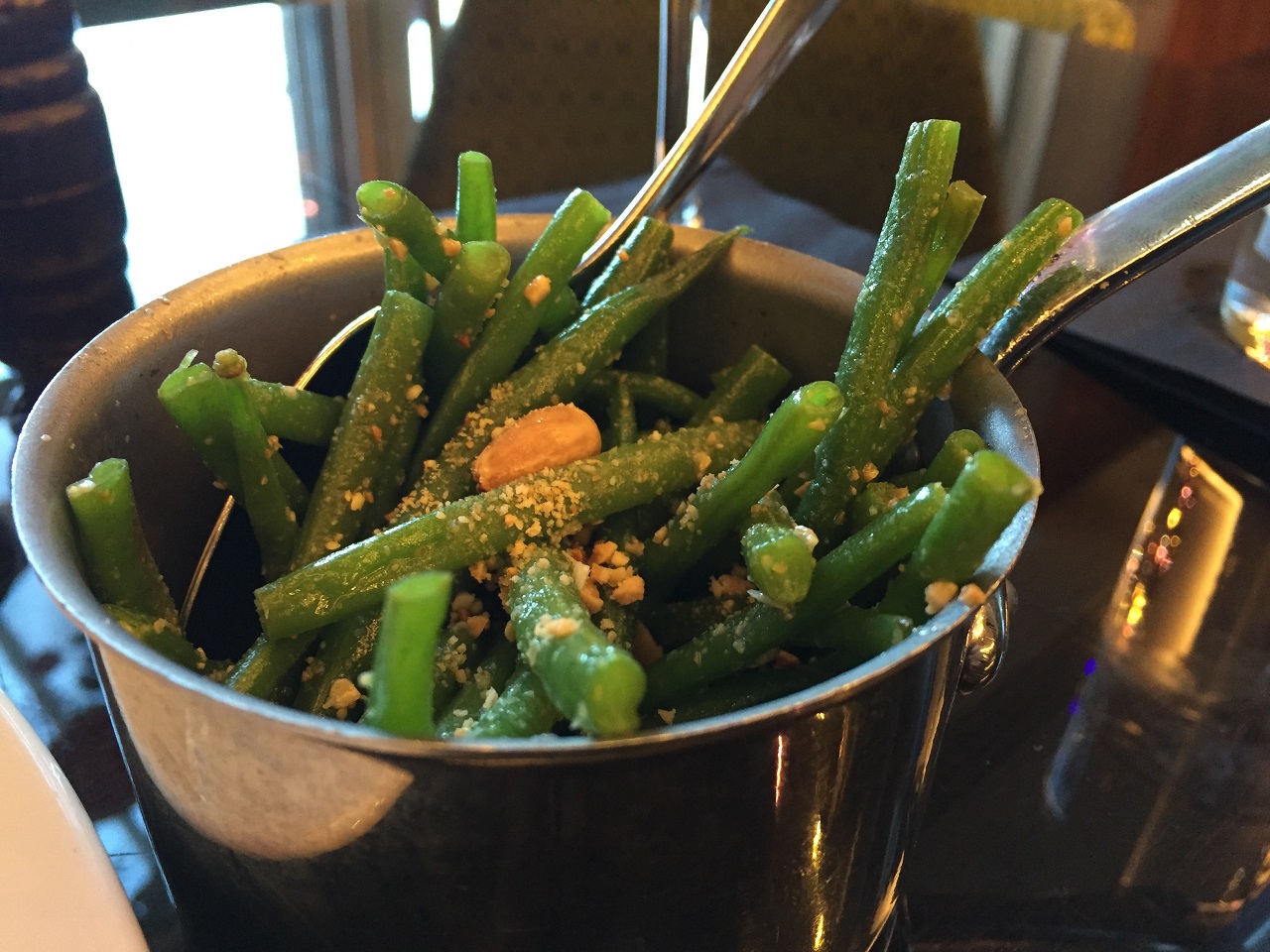 Choosing a table by the window inside, I was offered bar snacks which I declined while waiting on my burger, chunky chips (fries) and side of green beans with almonds (had to add something healthy). I didn’t realize how hungry I was but I ate the entire meal – bun included (so much for my gluten free stint). It was quite a satisfying meal and tasty – Scottish beef has a different flavor than what we are used to in the U.S.